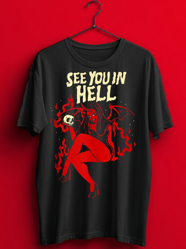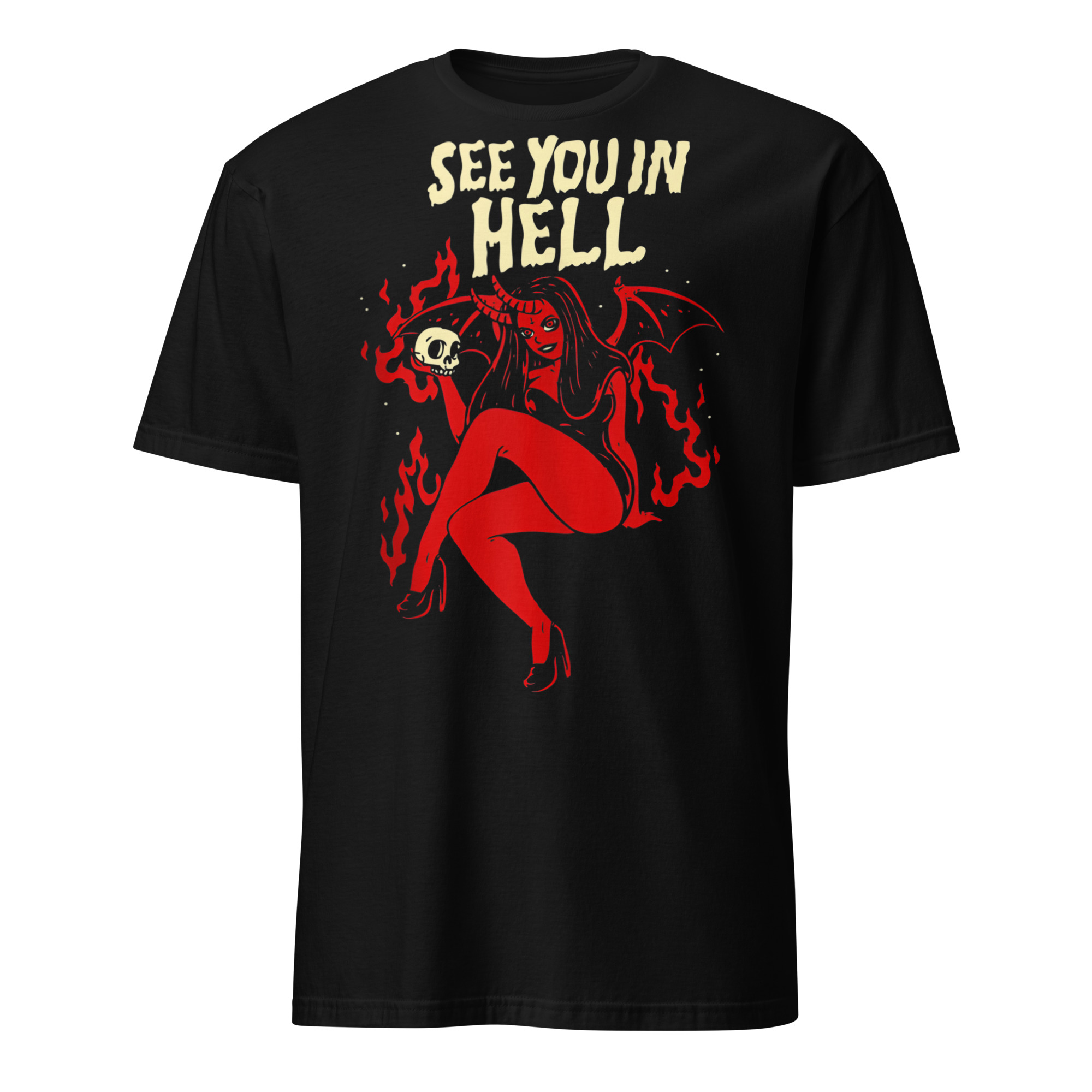 T-shirt i svart med en kvinnlig djävul och texten ’See you in hell’ som dekoration på framsidan. Passar perfekt till både män och kvinnor som antagligen kommer att hamna i helvetet. Tröjan är tillverkad i en supermjuk kvalitet i 100% bomull.