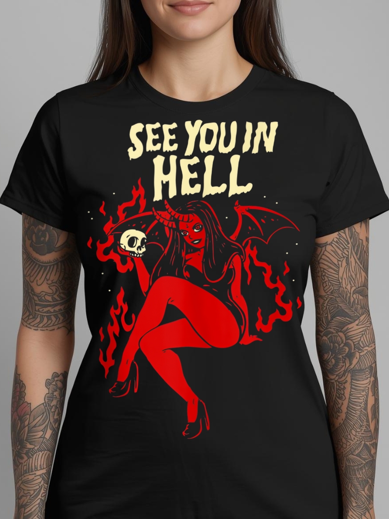 Semi-fitted t-shirt i svart med en kvinnlig djävul och texten ’See you in hell’ som dekoration på framsidan. Passar perfekt till kvinnor som antagligen kommer att hamna i helvetet. Tröjan är tillverkad i en supermjuk kvalitet i 100% bomull.