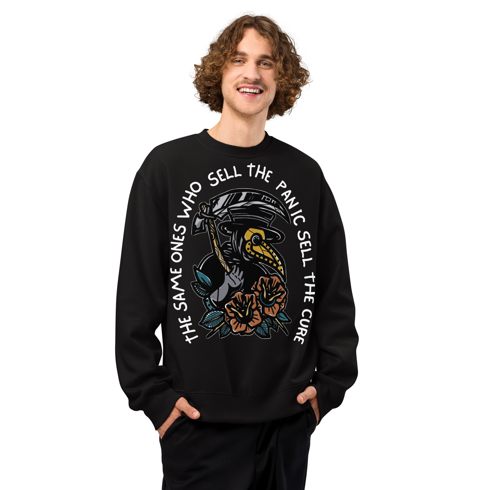 Varm och skön sweatshirt i oversize-modell tillverkad i blandad bomull/polyester med ett stort tatueringsinspirerat motiv med texten ’The same ones who sell the panic sell the cure’ som dekoration på framsidan. Tröjan har ’relaxed’ passform och passar både män och kvinnor perfekt.