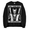 Varm och skön sweatshirt i svart tillverkad i blandad bomull/polyester med djävulen som håller i två ben och texten ’I only think about sex and death’ som dekoration på framsidan. Tröjan passar perfekt till både män och kvinnor som älskar den alternativa stilen.
