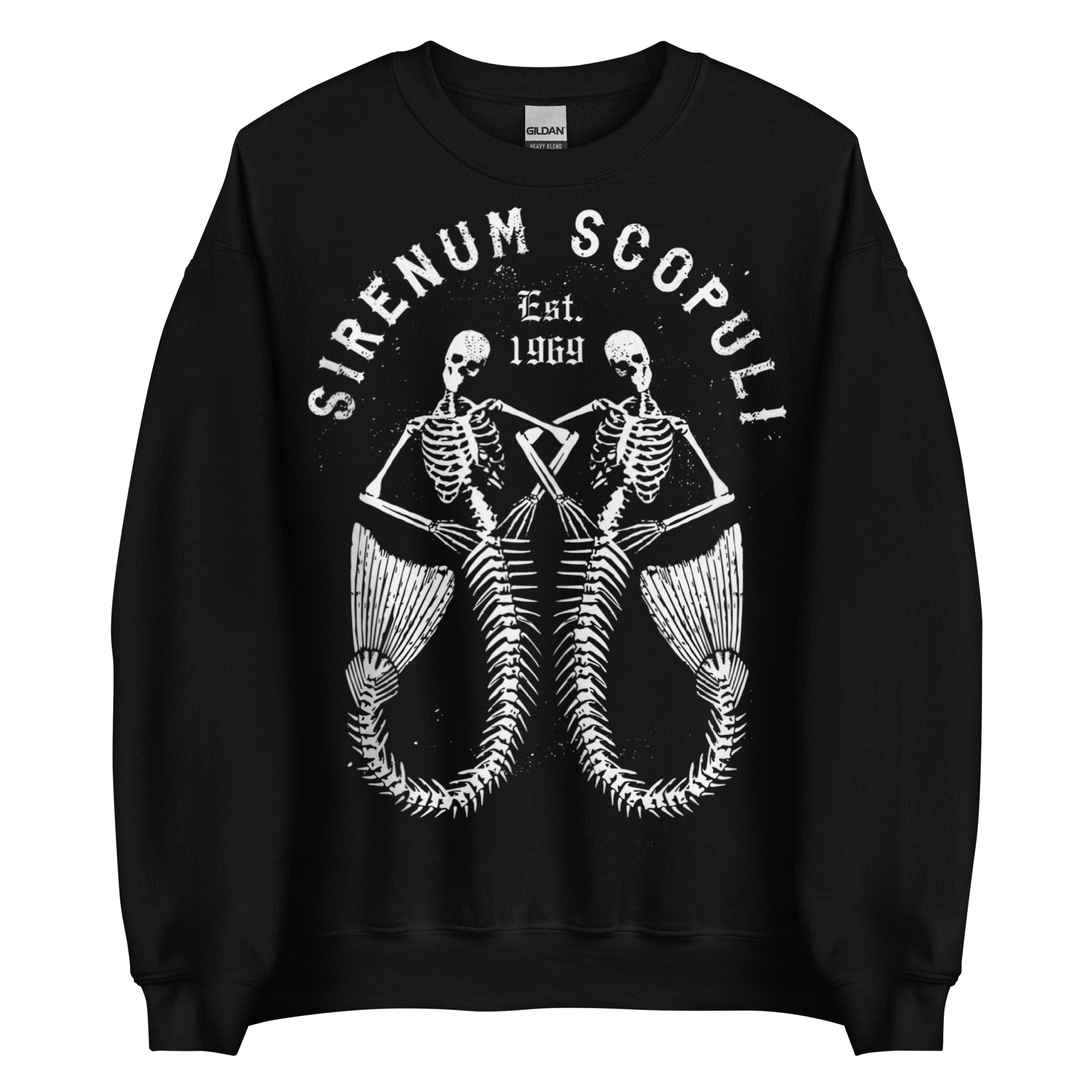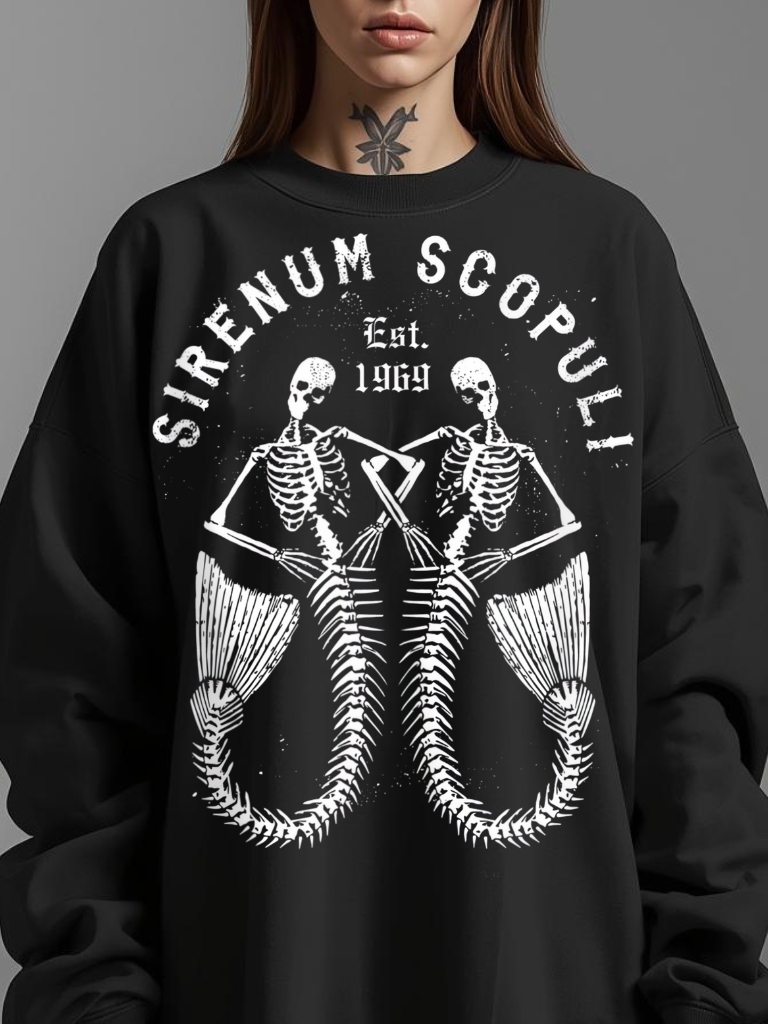 Varm och skön sweatshirt i svart tillverkad i blandad bomull/polyester med ett stort alternativt tryck med två sjöjungfruskelett och texten ’Sirenum Scopuli’ som dekoration på framsidan. Tröjan passar perfekt till både män och kvinnor som älskar den alternativa stilen.