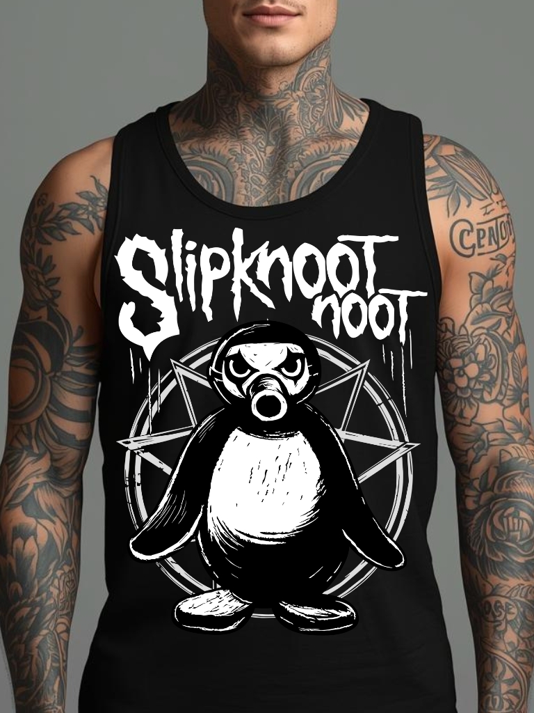 Linne i svart med en arg pingvin och texten ’Slipknoot noot’ som tryck på framsidan. Tillverkad i en skön kvalitet i 100% bomull och passar perfekt till både män och kvinnor.