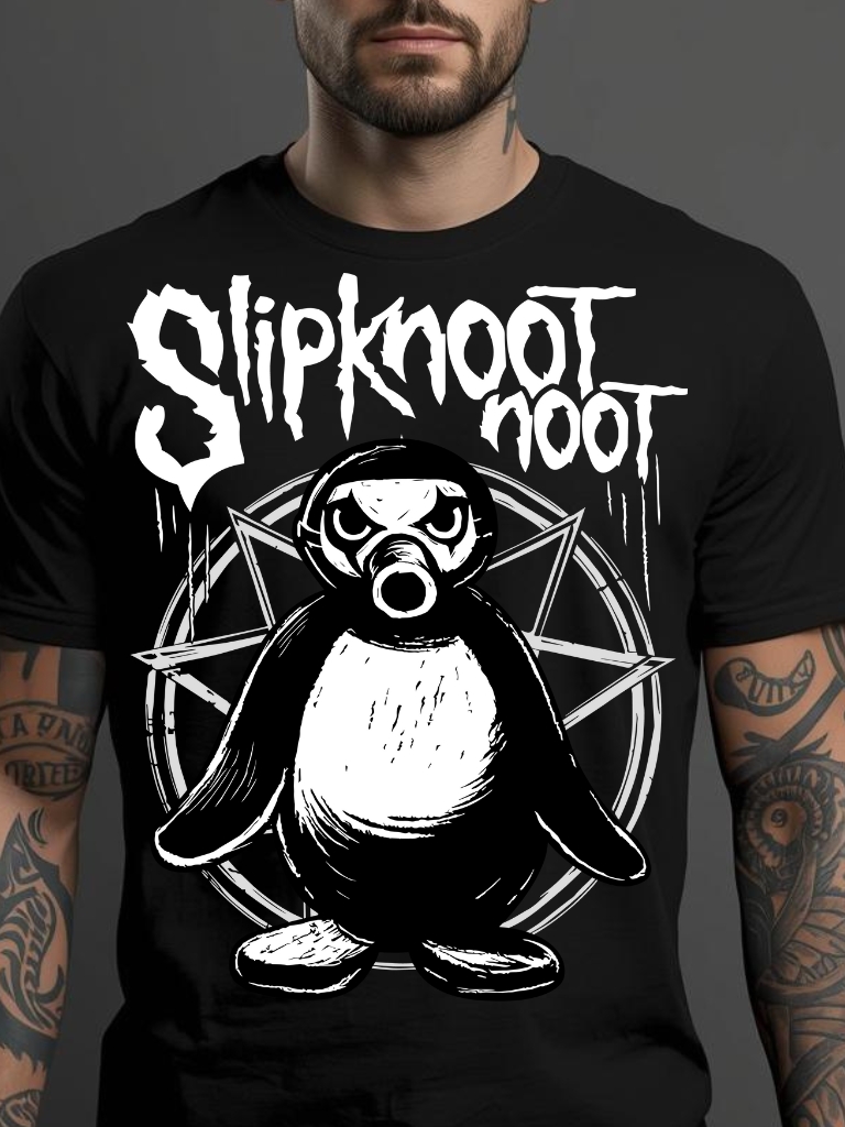 T-shirt i svart med ett stort tryck med en arg pingvin och texten ’Slipknoot noot’ som dekoration på framsidan. Passar perfekt till både män och kvinnor och är tillverkad i en supermjuk kvalitet i 100% bomull.