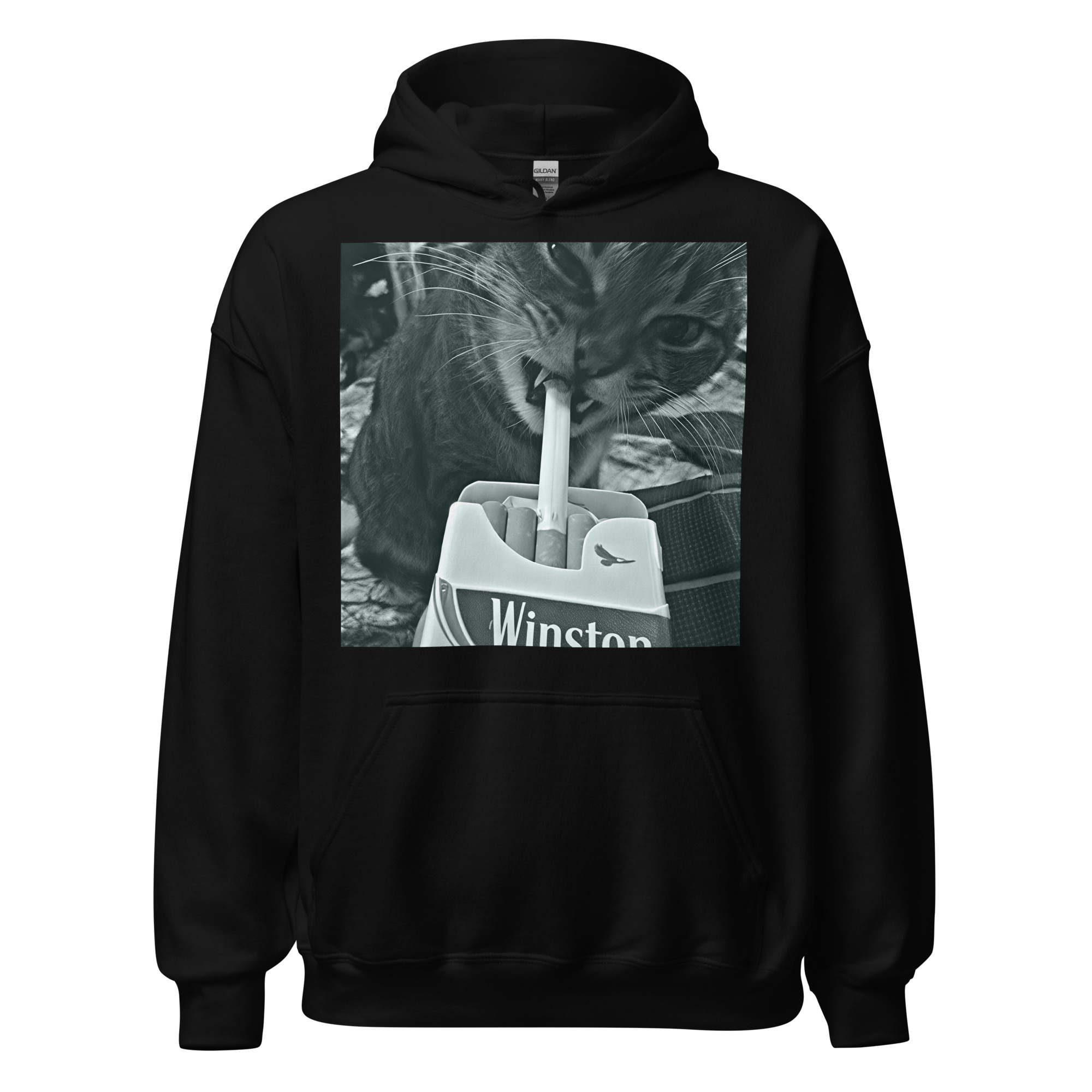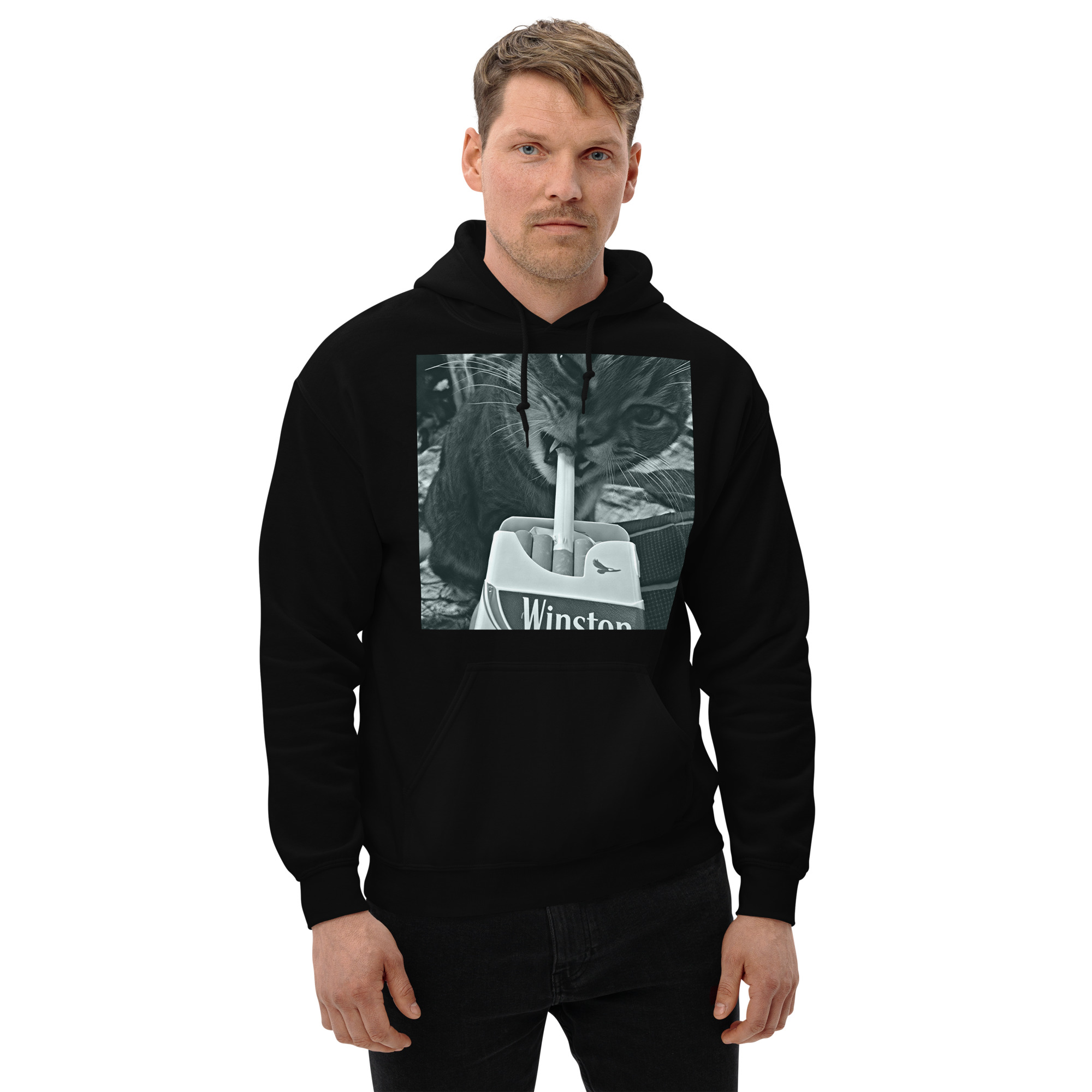 Hoodie i unisex-modell tillverkad i en fin kvalitet i blandad bomull och polyester. På framsidan återfinns ett stort motiv med en katt som röker som dekoration. Hoodien håller värmen riktigt bra och har ett otroligt mjukt tyg.