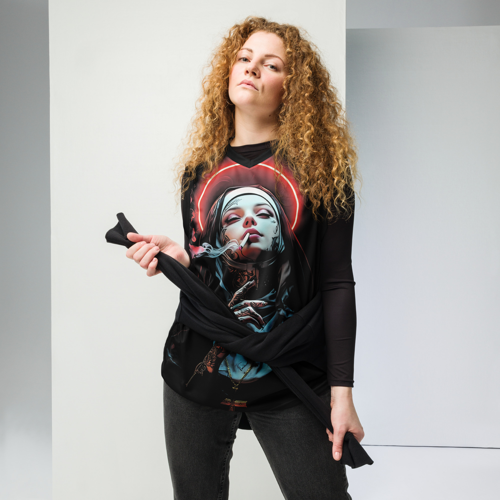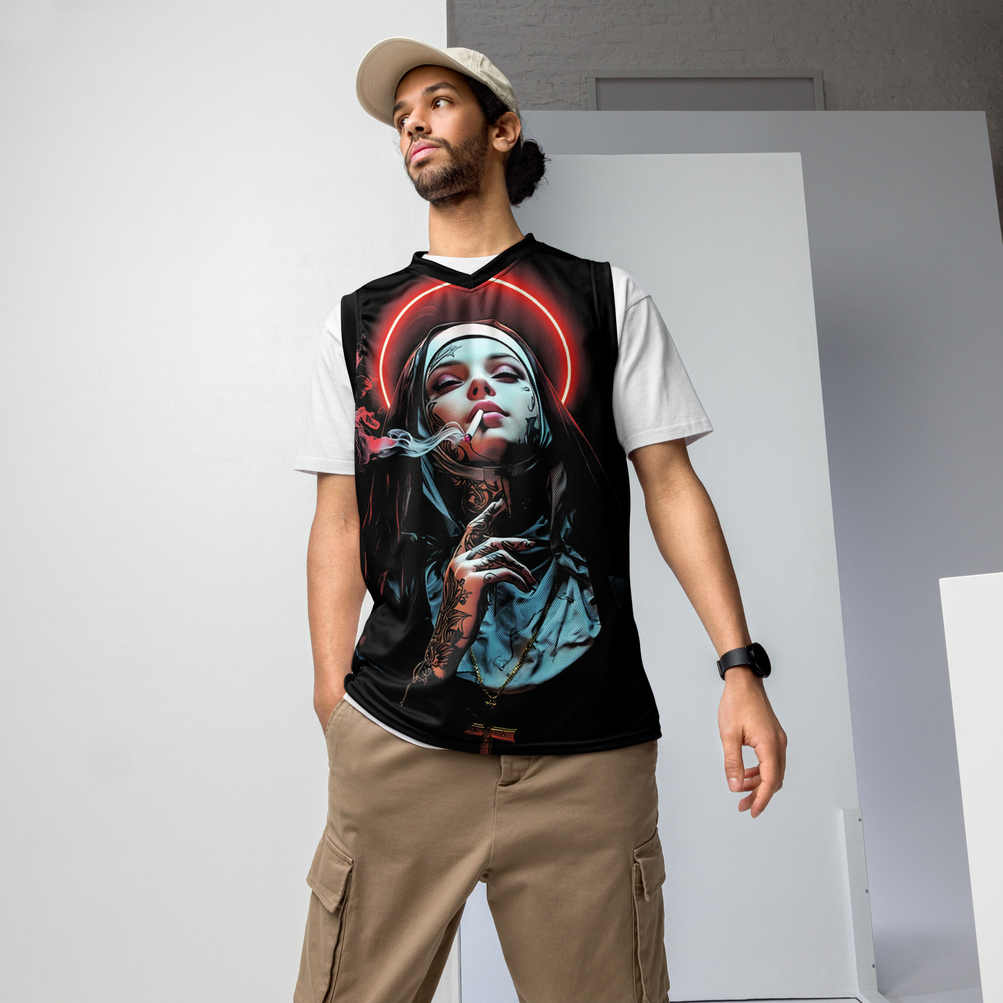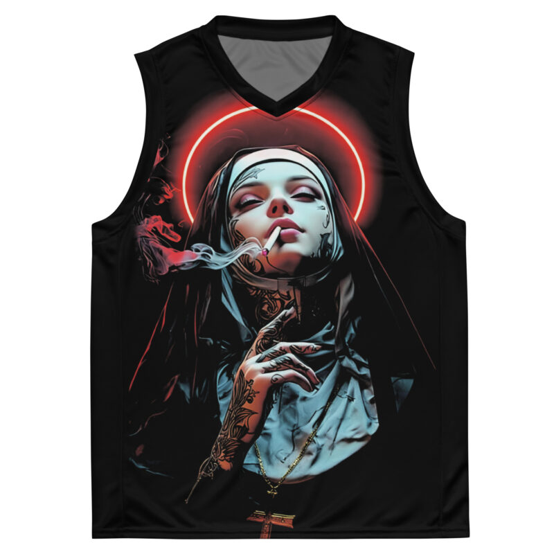 Riktigt snygg basket-jersey som passar perfekt till både män och kvinnor. Linnet är dekorerat med en tatuerad nunna som röker en cigarett på framsidan. Tillverkad i lyxig återvunnen polyester med normal passform. Materialet är fukttrasporterande och skyddar mot solens strålar (UPF50+). Tvåvägsstretch för att följa kroppens rörelser perfekt. Passar lika bra på träningen som på stan.