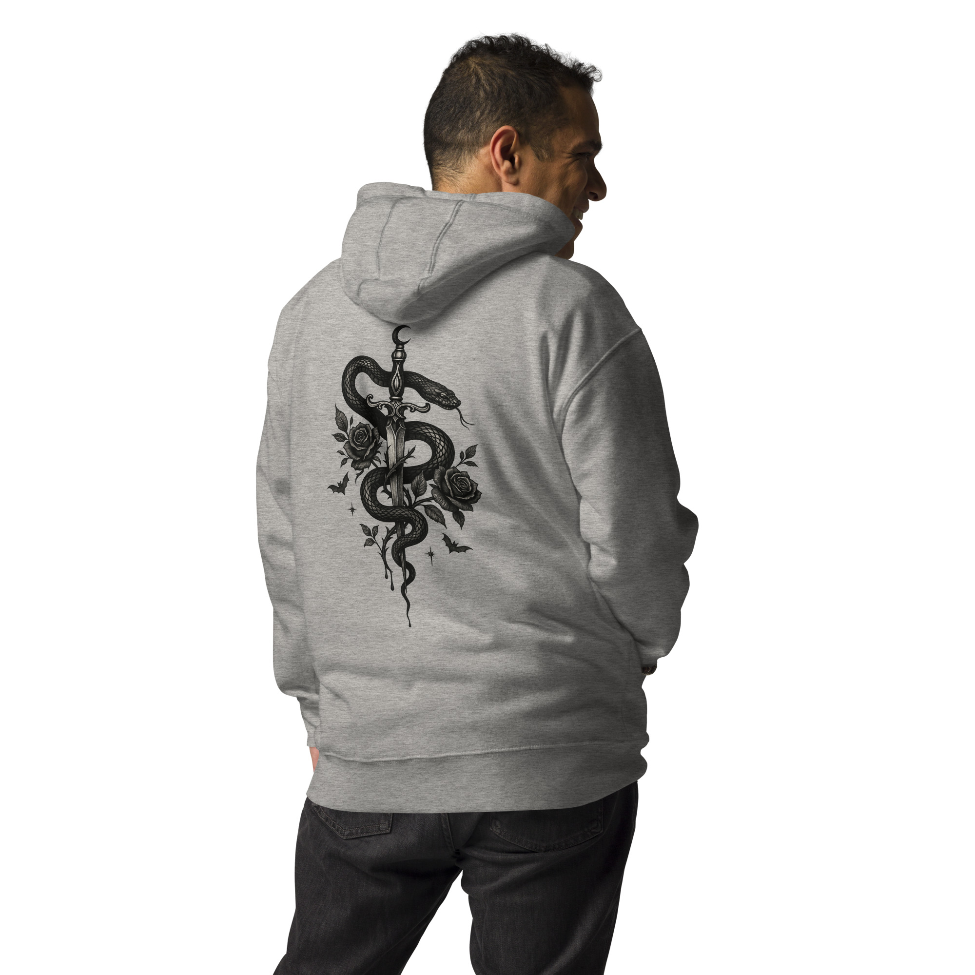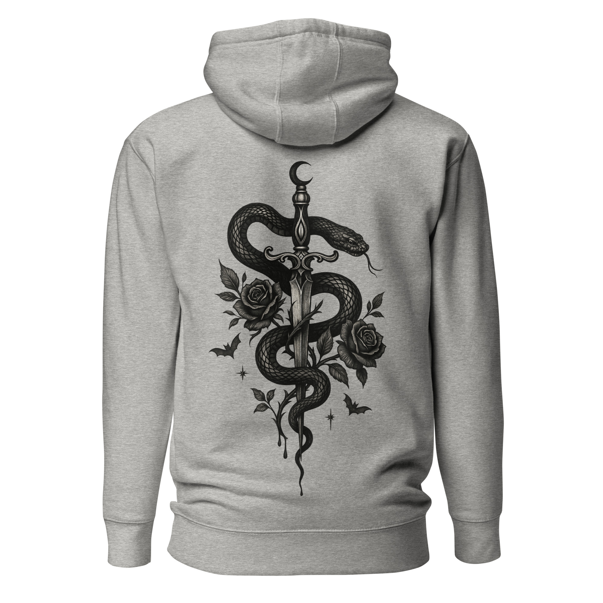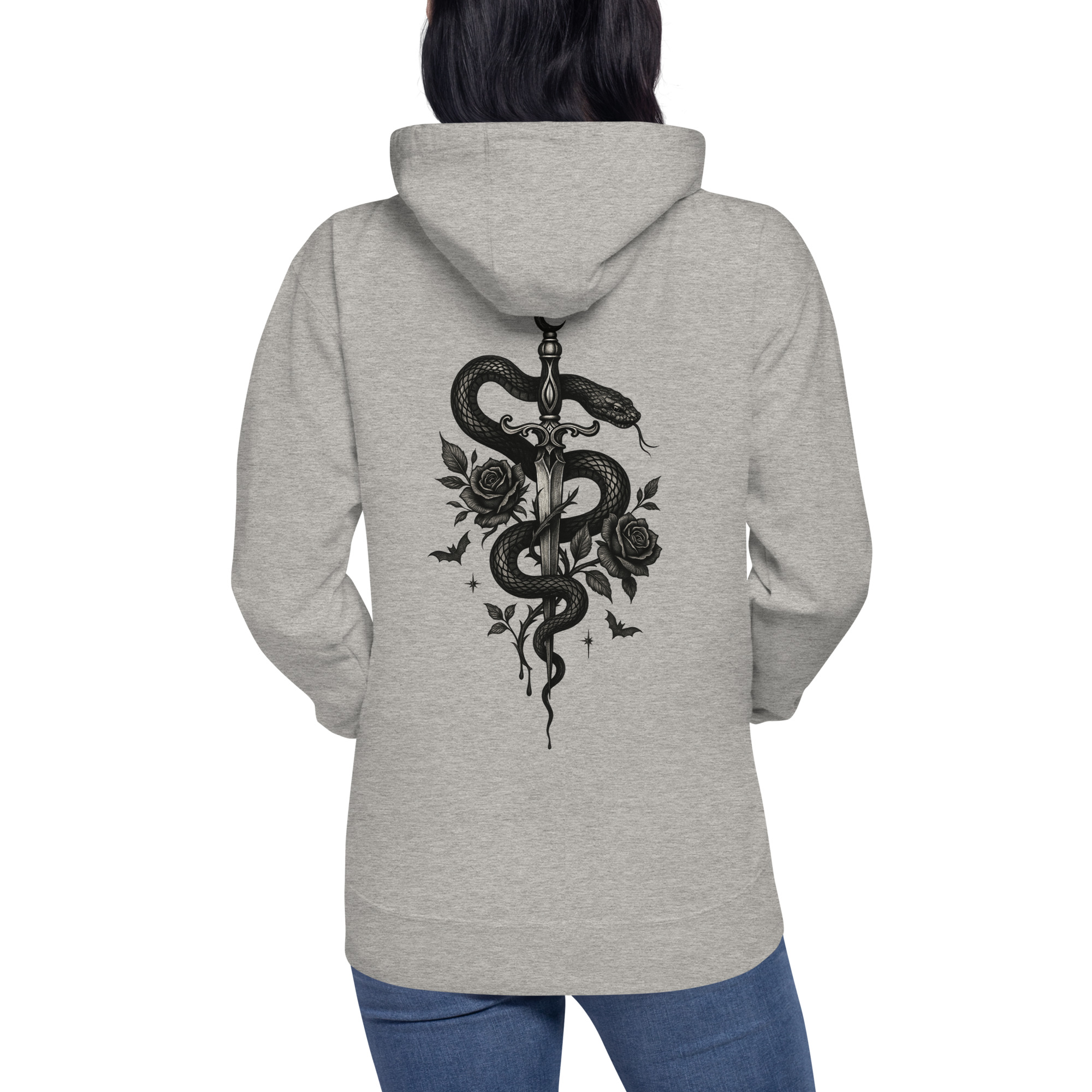 Hoodie i unisex-modell tillverkad i en extra fin kvalitet i blandad bomull och polyester. På baksidan återfinns en orm som slingrar sig runt en dolk som dekoration. Hoodien håller värmen riktigt bra och har ett otroligt mjukt tyg. Passar alla oss som älskar den alternativa stilen.