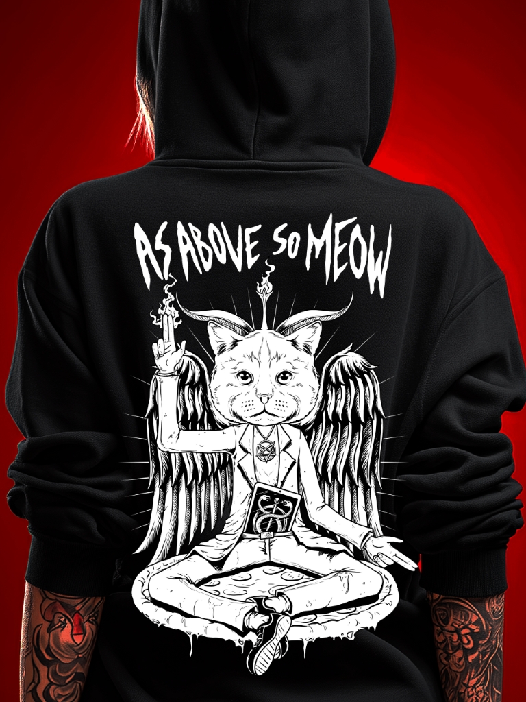 Snygg hoodie tillverkad i blandad bomull/polyester med ett alternativt tryck med katt-Baphomet och texten ’As above, so meow’ som dekoration på baksidan. Tröjan är i unisex-modell så den passar perfekt till både män och kvinnor.