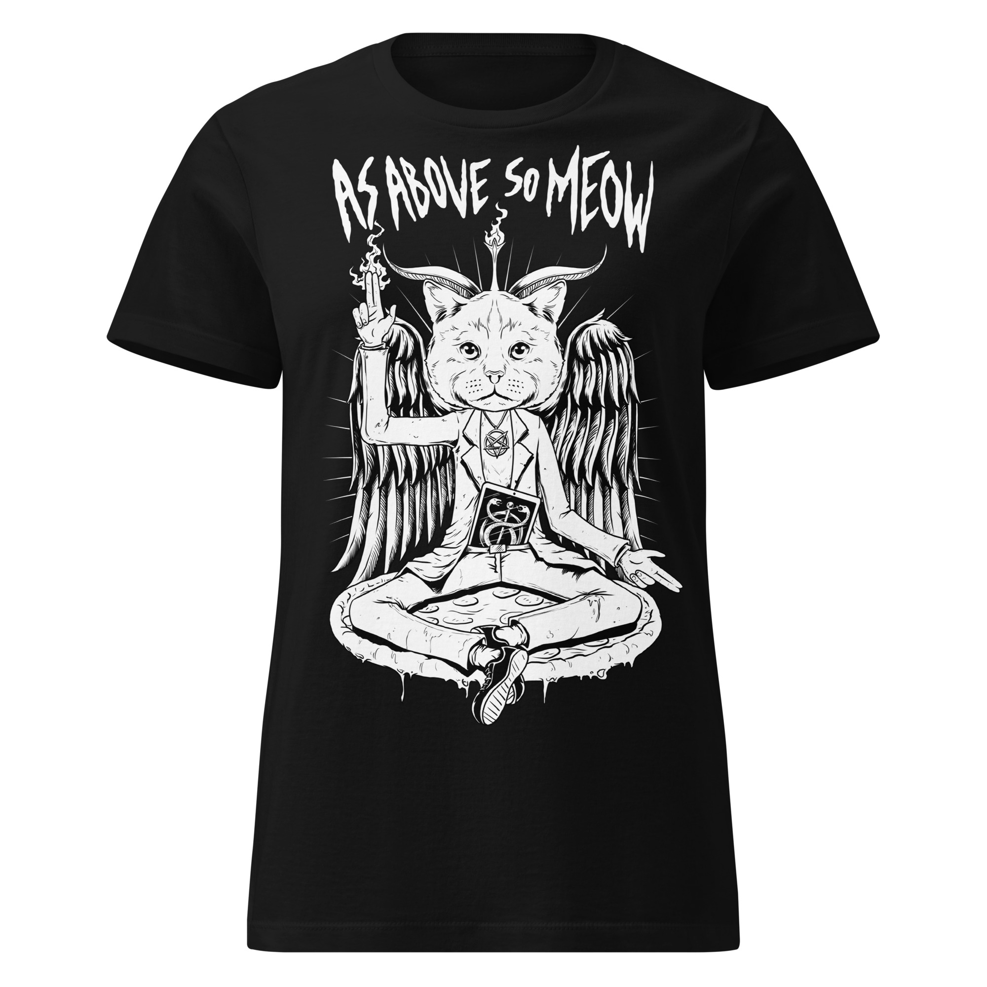 Semi-fitted t-shirt i svart med ett stort tryck med en katt-Baphomet och texten ’As above, so meow’ som dekoration på framsidan. Passar perfekt till kvinnor som älskar alternativa kläder. Tröjan är tillverkad i en fin kvalitet i 100% bomull.