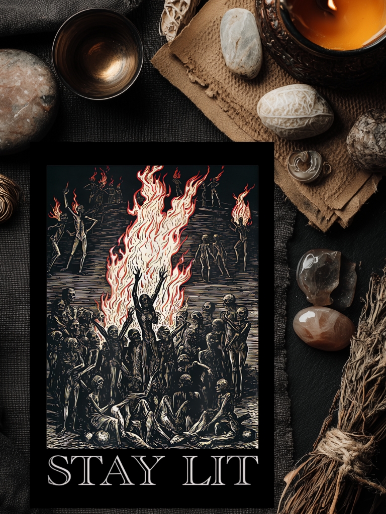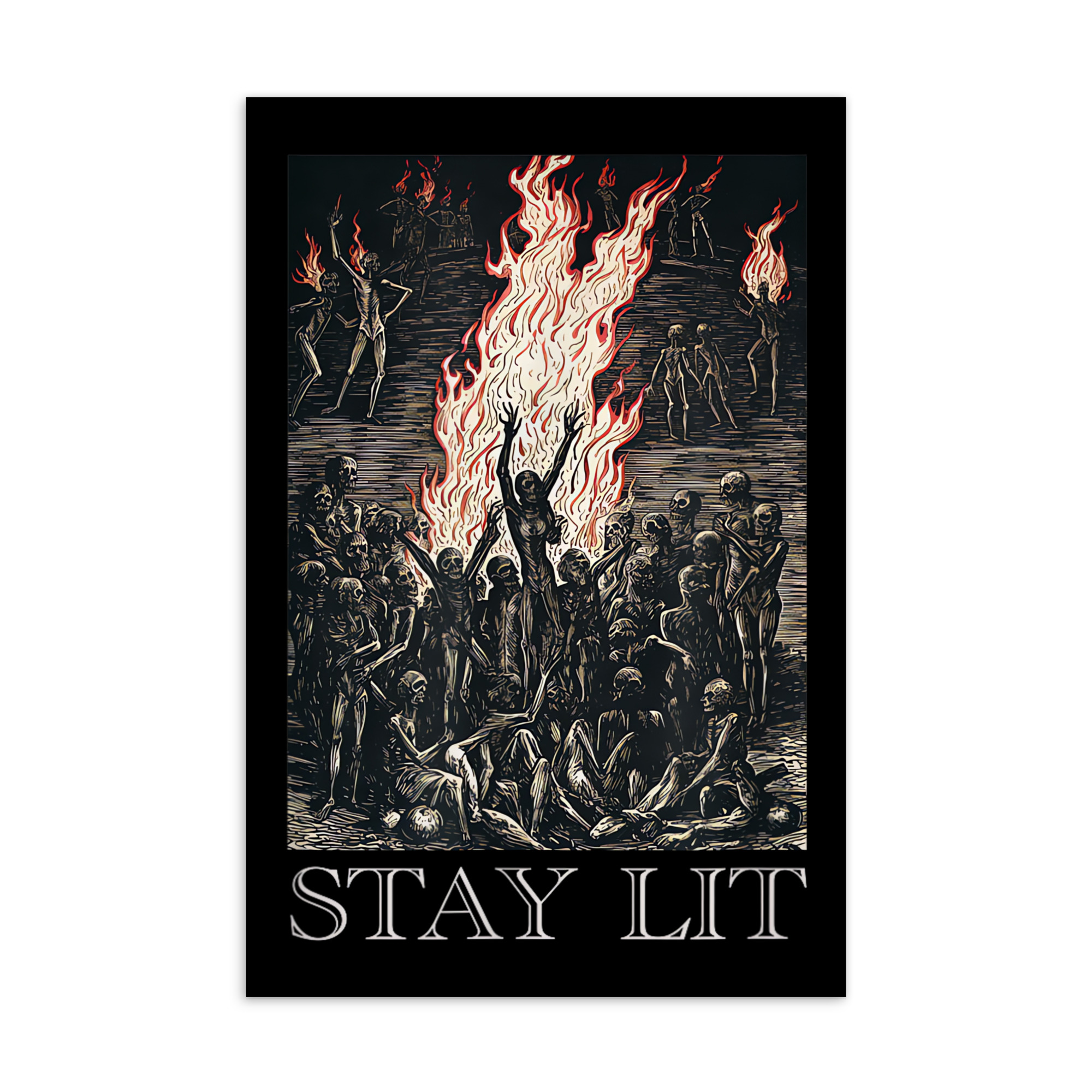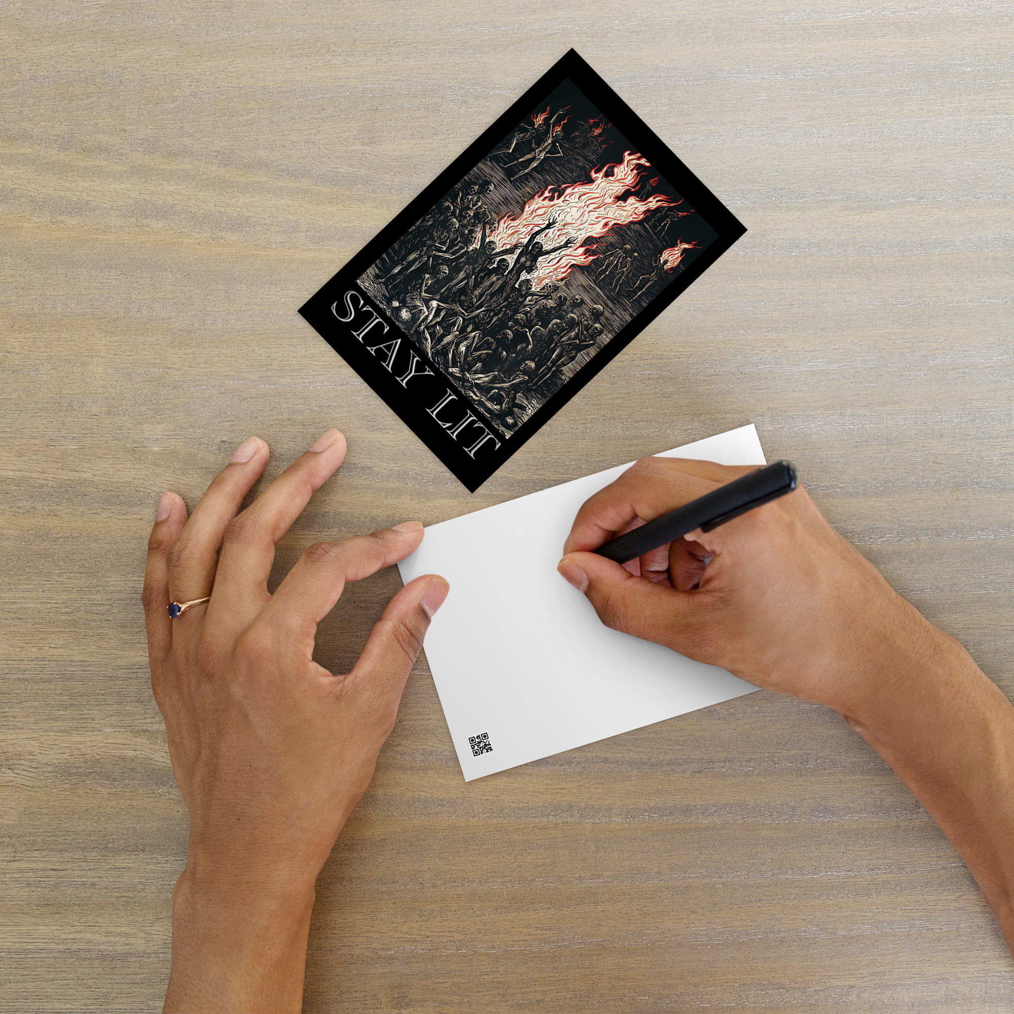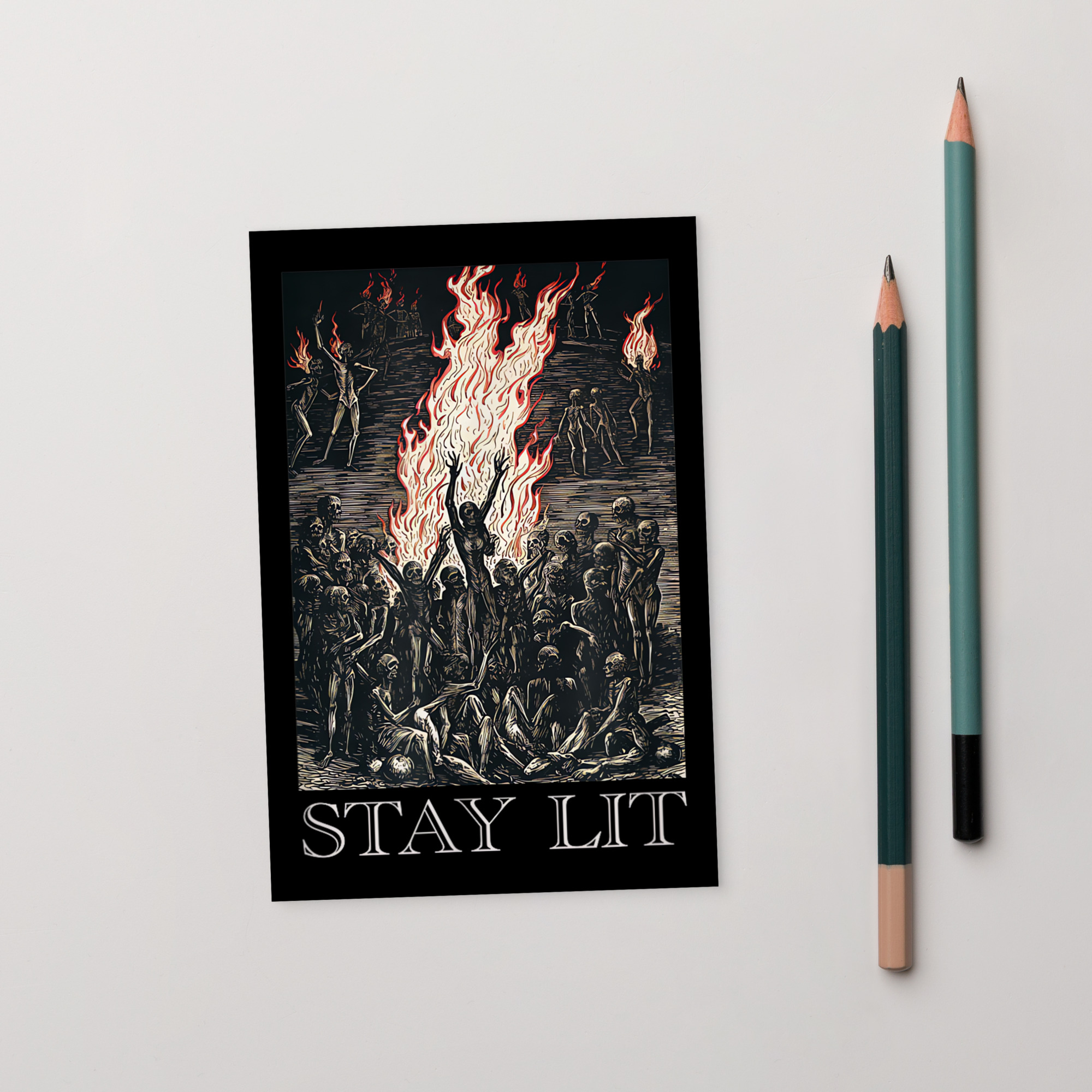 Fantastiskt vykort med ett detaljrikt alternativt motiv med texten ’Stay lit’ som tryck. Kortet kan skickas till någon eller ramas in som ett mindre konstverk. Tillverkat i kraftigt papper av hög kvalitet. Höjden är 15,2 cm.