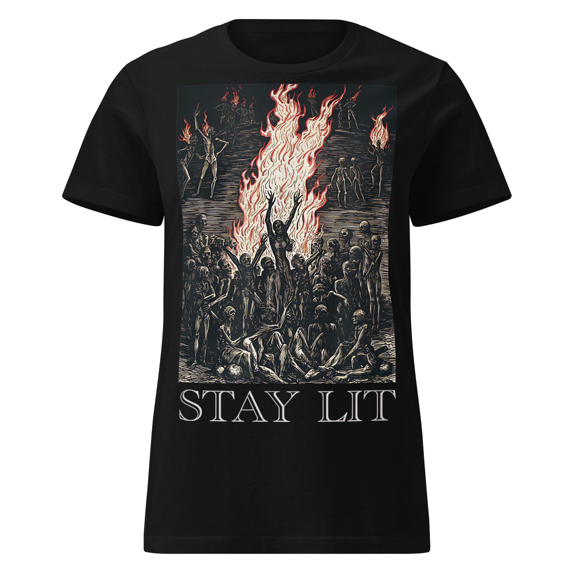 Semi-fitted t-shirt i svart med ett stort alternativt tryck med texten ’Stay lit’ som dekoration på framsidan. Passar perfekt till kvinnor som älskar den alternativa klädstilen. Tröjan är tillverkad i en supermjuk kvalitet i 100% bomull.