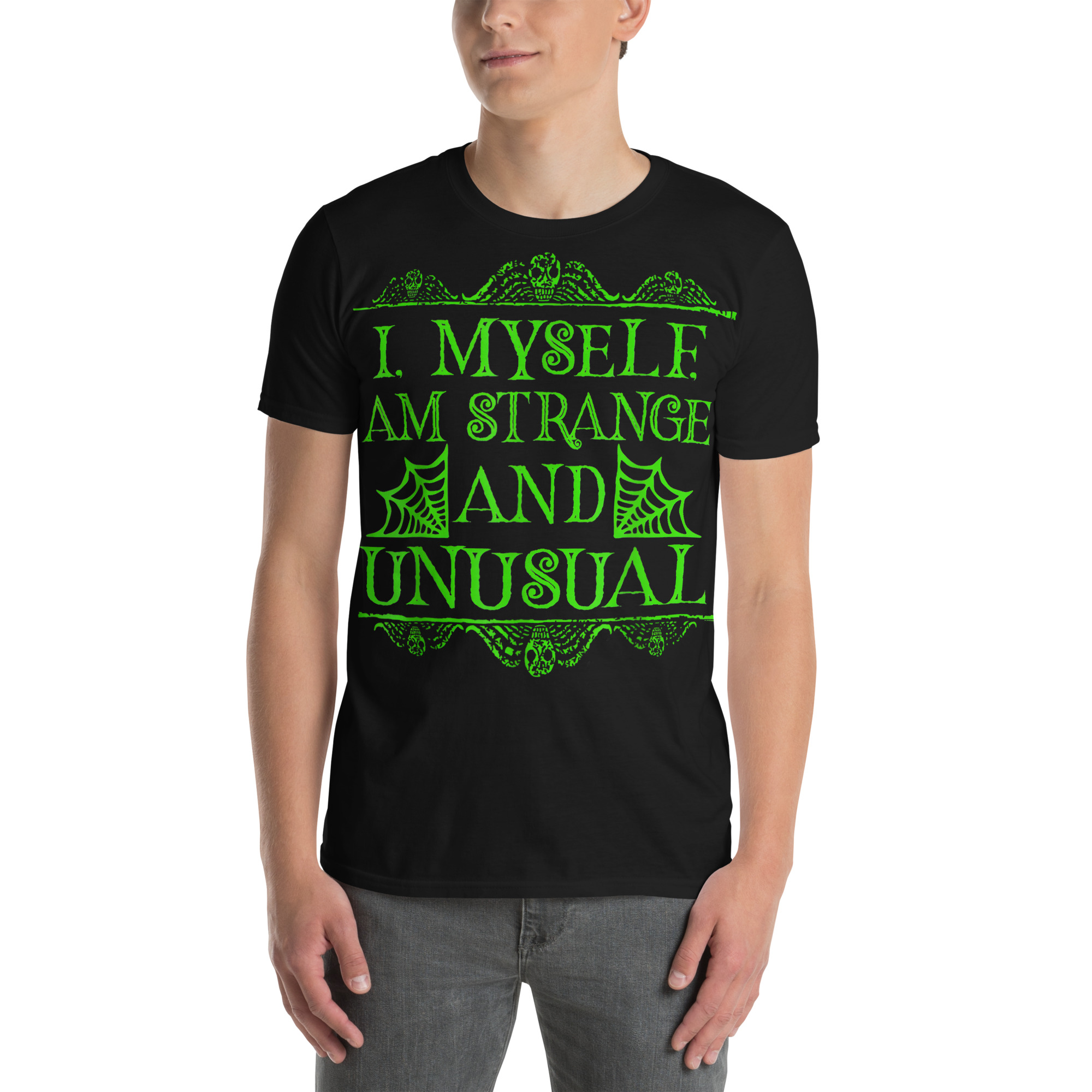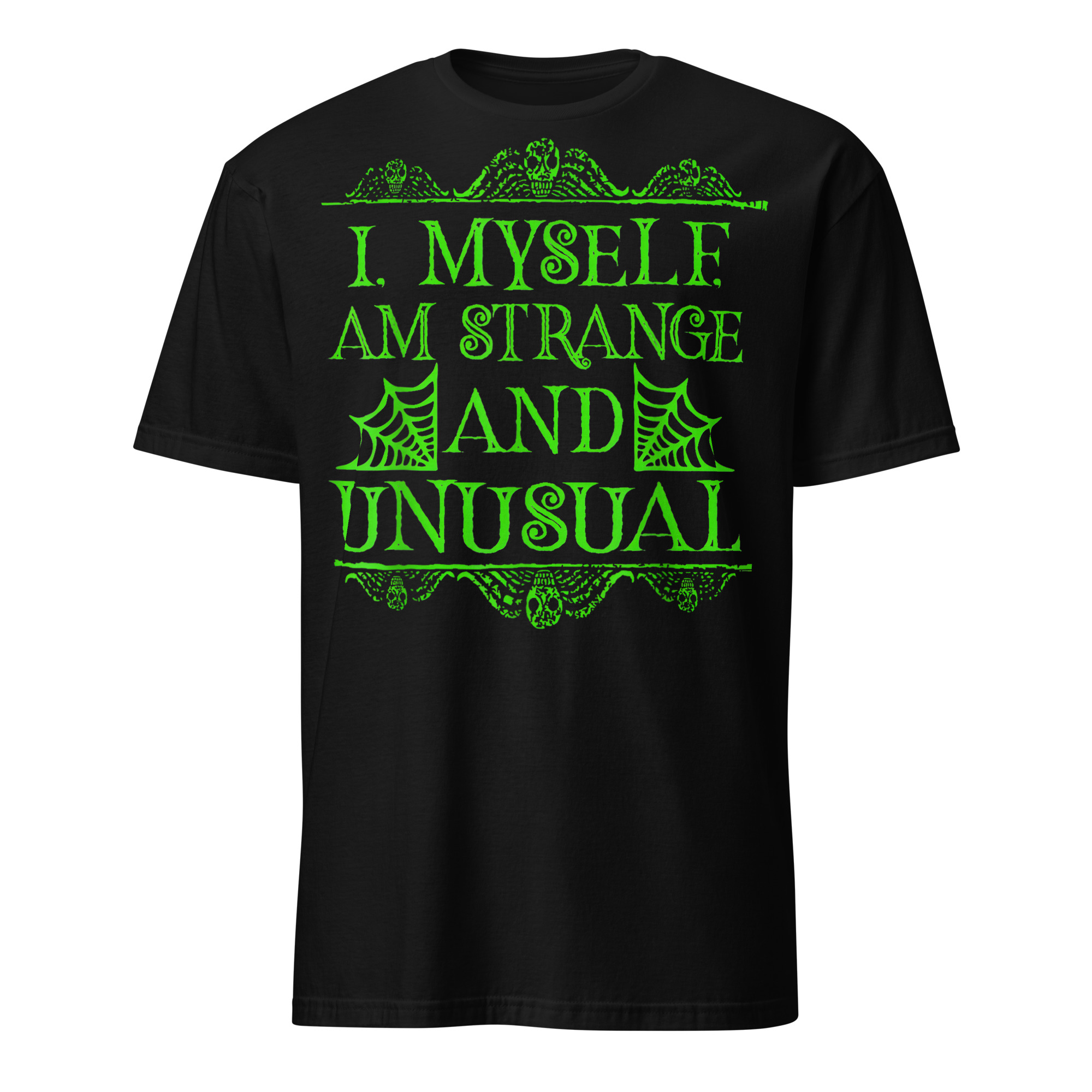 T-shirt i svart med texten ’I myself, am strange and unusual’ som dekoration på framsidan. Passar perfekt till kvinnor och män som älskar den alternativa klädstilen. Tröjan är tillverkad i en supermjuk kvalitet i 100% bomull.