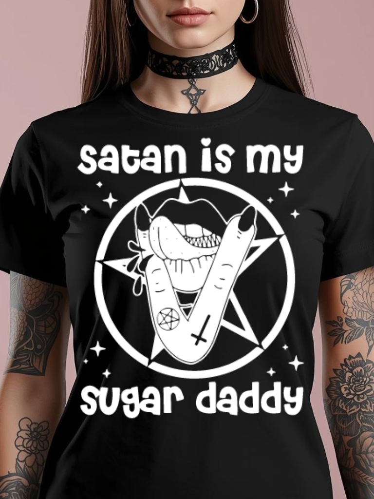 Semi-fitted t-shirt i svart med ett stort alternativt tryck med texten ’Satan is my sugar daddy’ som dekoration på framsidan. Passar perfekt till kvinnor som älskar den alternativa stilen. Tröjan är tillverkad i en fin kvalitet i 100% bomull.