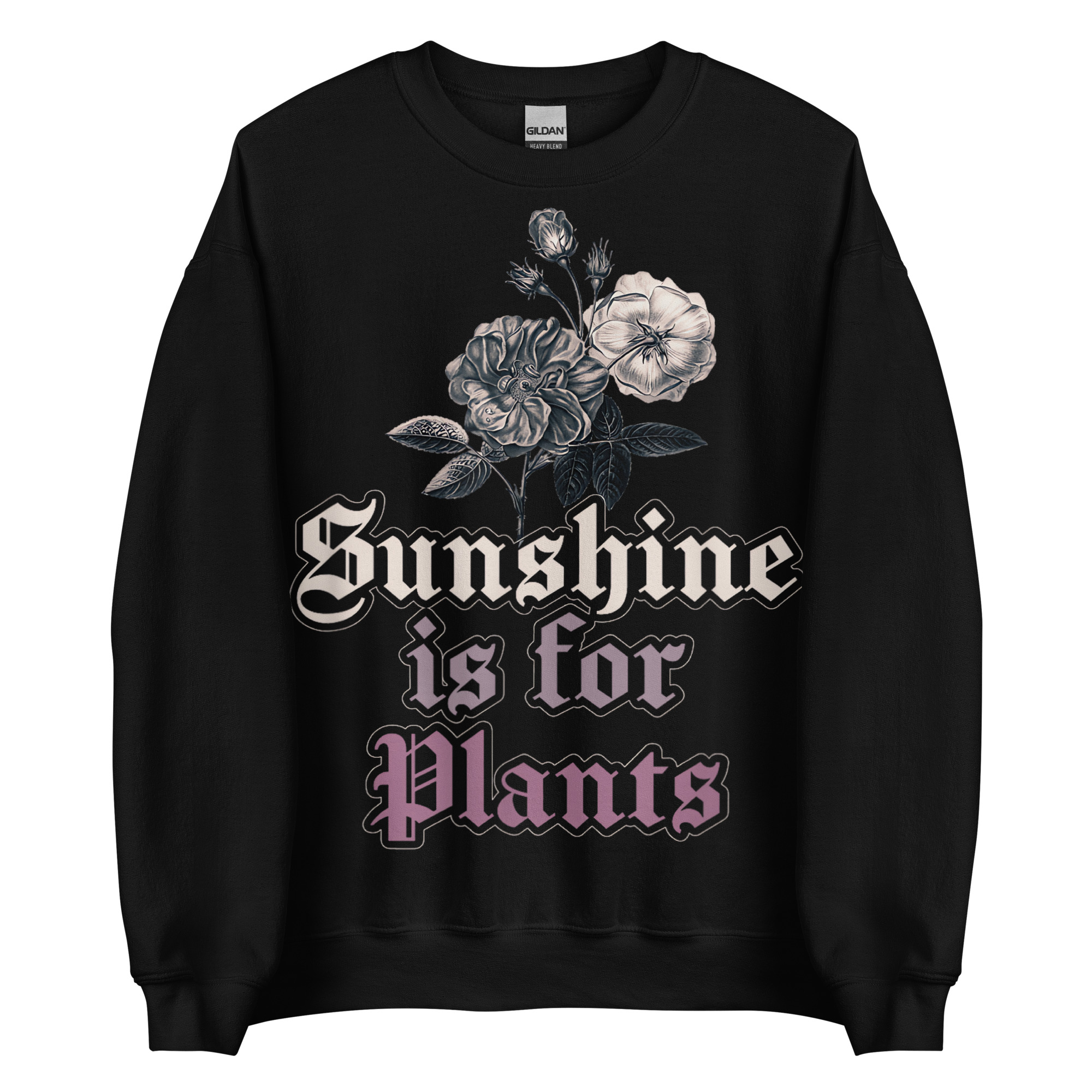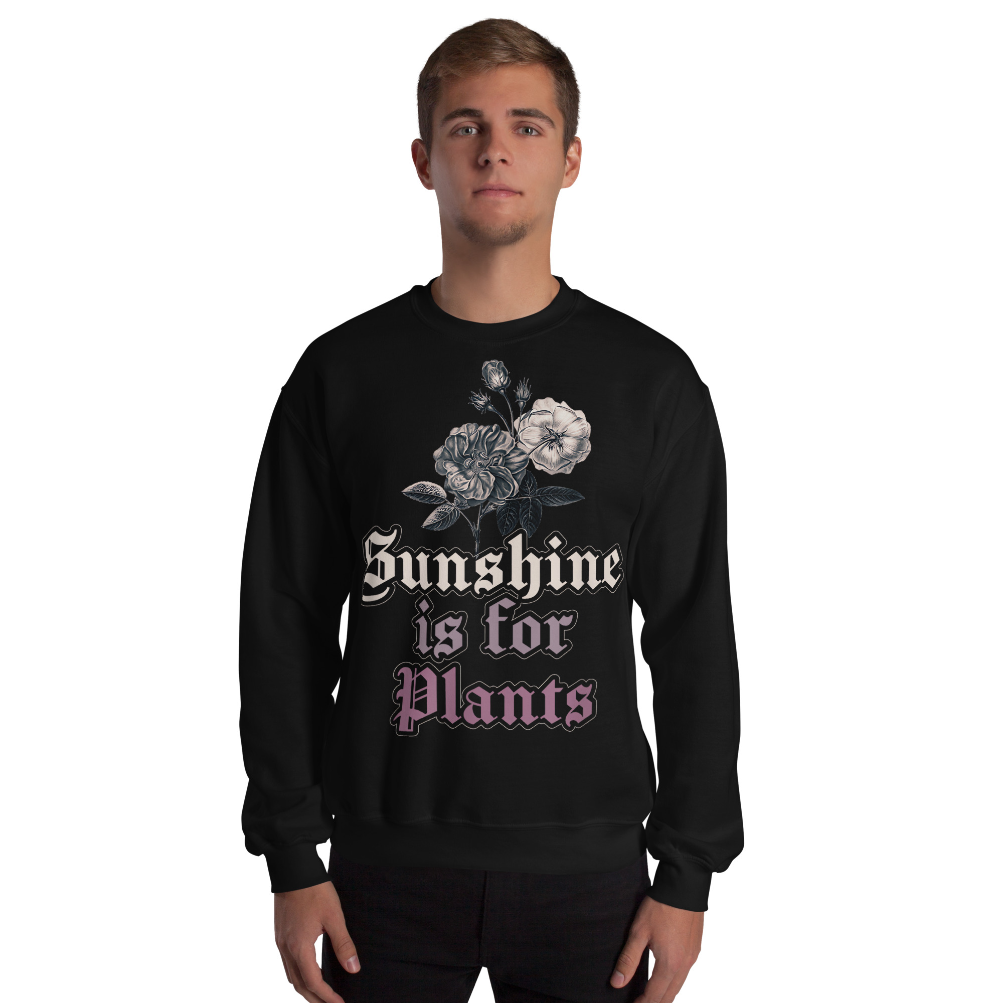 Varm och skön sweatshirt i svart tillverkad i blandad bomull/polyester med mörka blommor och texten ’Sunshine is for plants’ som dekoration på framsidan. Unisex-modell som passar perfekt till både män och kvinnor som älskar den alternativa stilen, men inte av solen. Storleken är XXL.