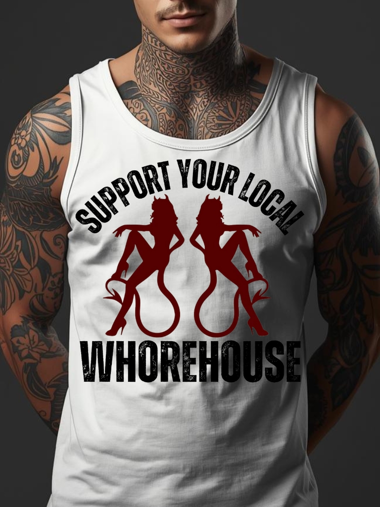Linne i vitt med två kvinnliga djävular och texten ’Support your local whorehouse’ som motiv på framsidan. Tillverkad i en skön kvalitet i 100% bomull. Passar både män och kvinnor.