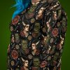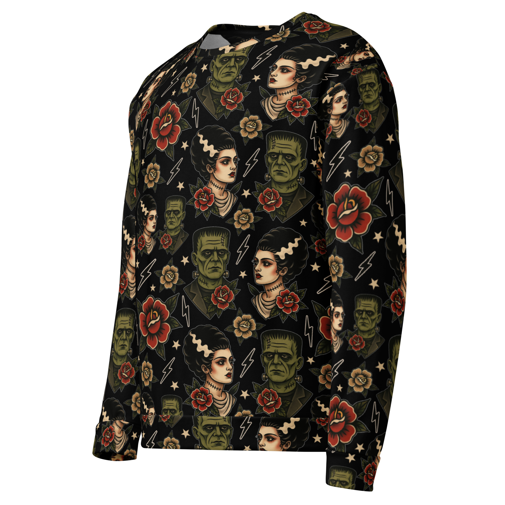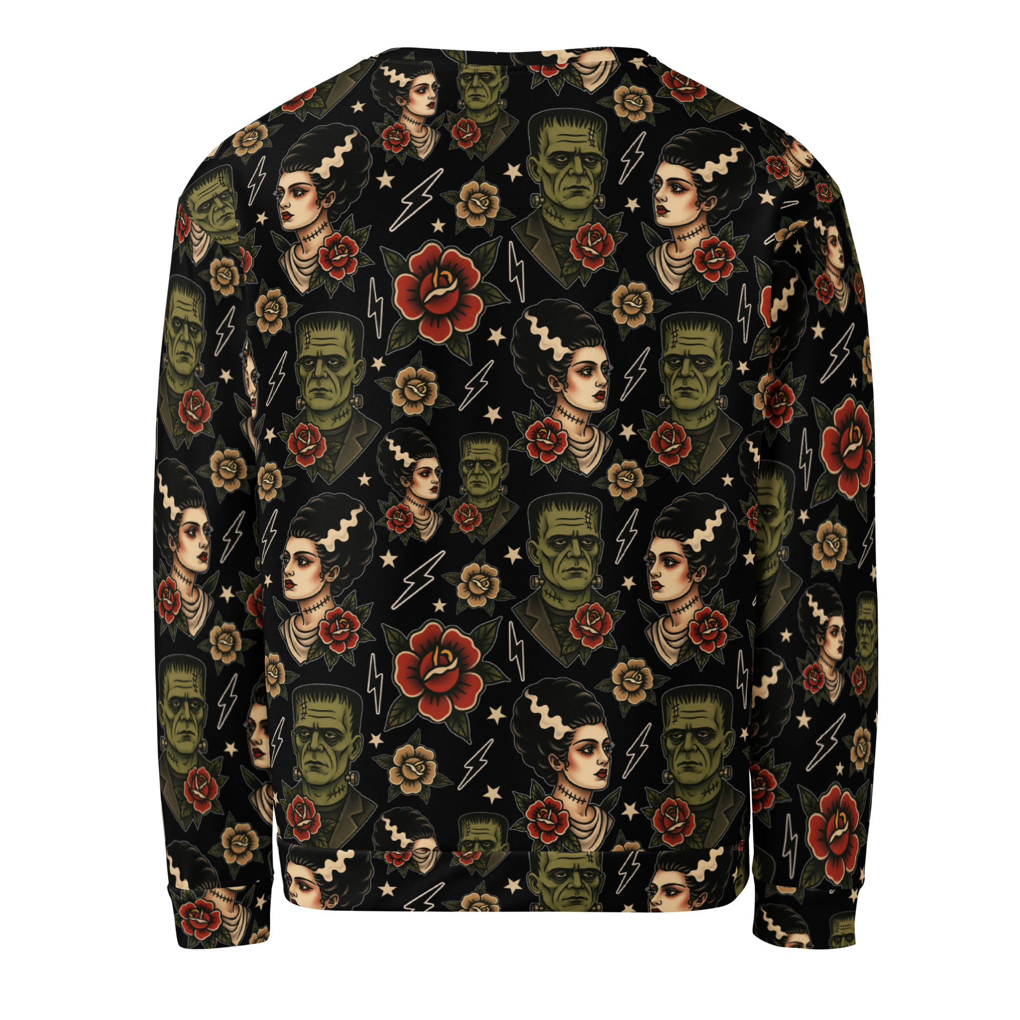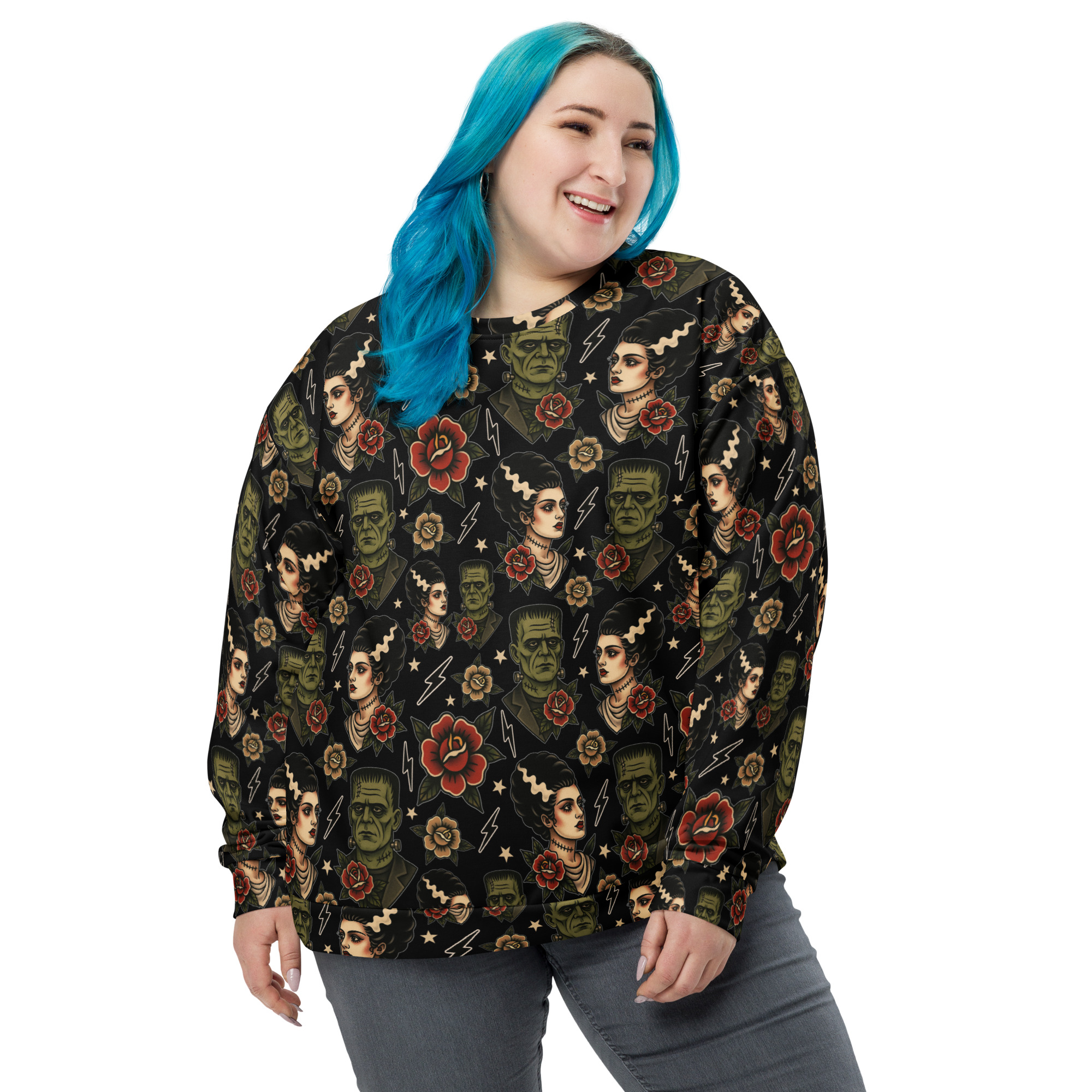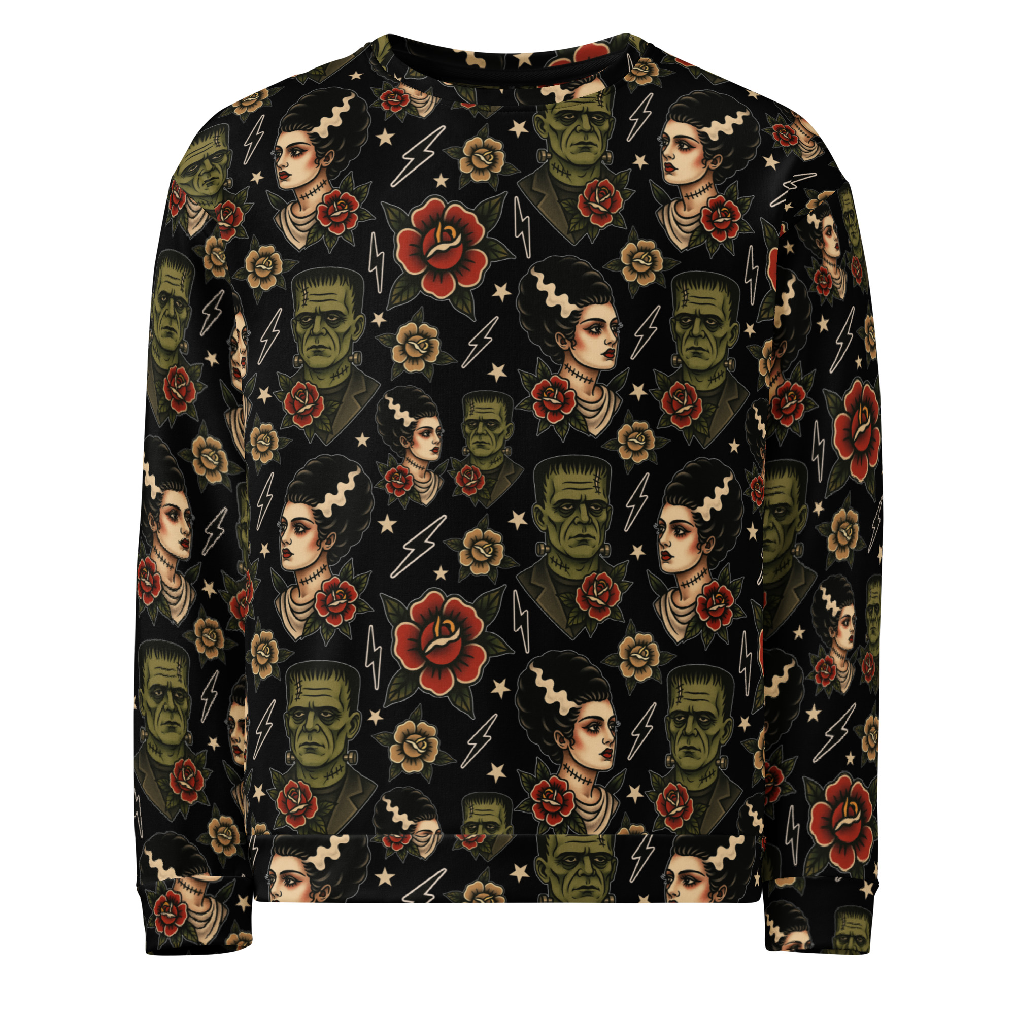 Varm och skön sweatshirt med Frankensteins monsters och brud i old school-tatueringsstil. Unisex-modell tillverkad i en superskön kvalitet i blandad polyester och elastan. Kommer verkligen dra blickarna till sig när du använder den och den kommer garanterat bli din nya favorit. Tyget trycks och sys ihop för hand exklusivt för dig efter din beställning.