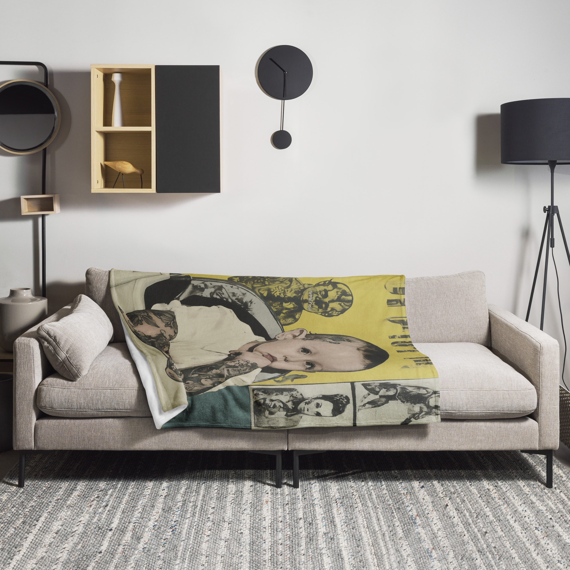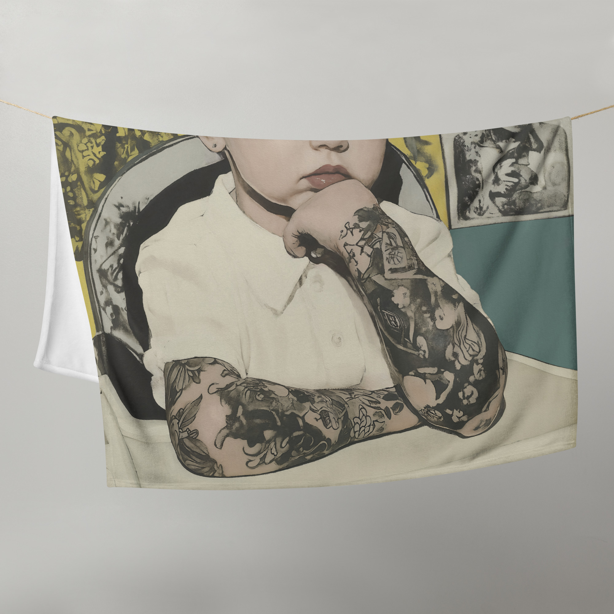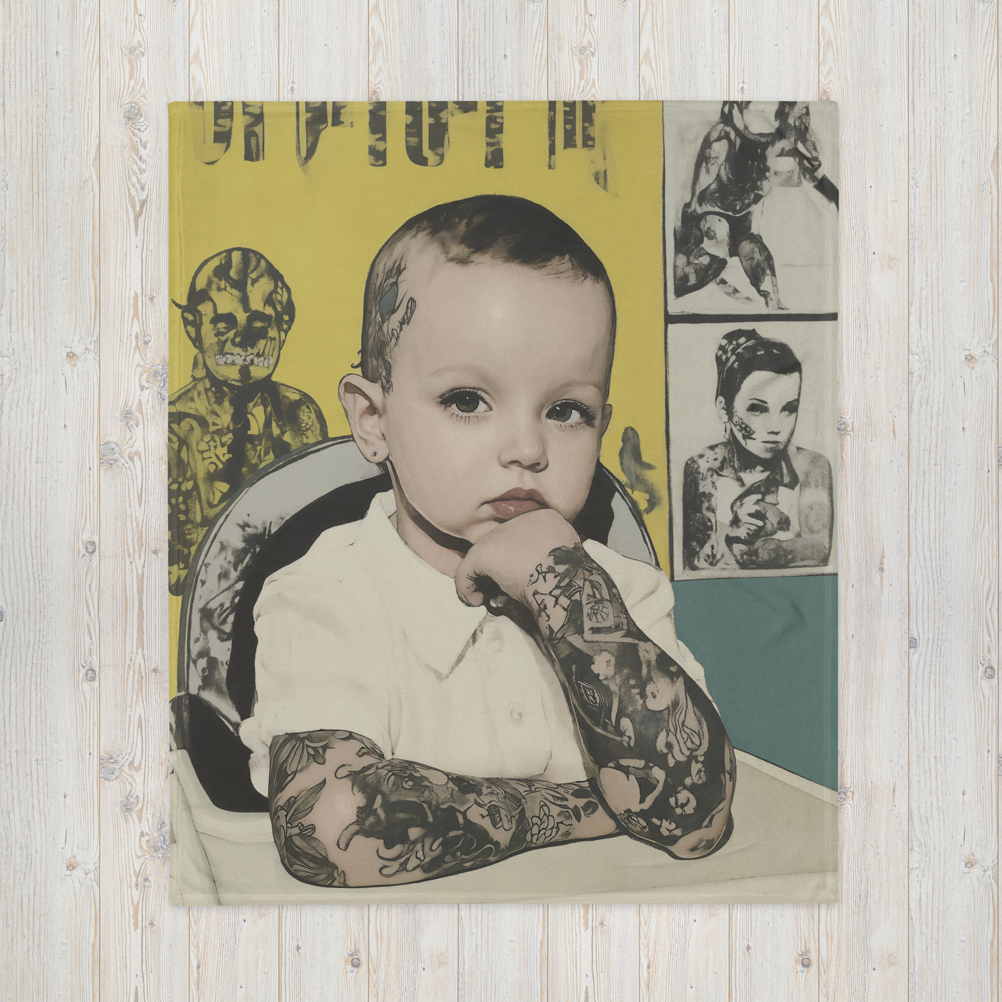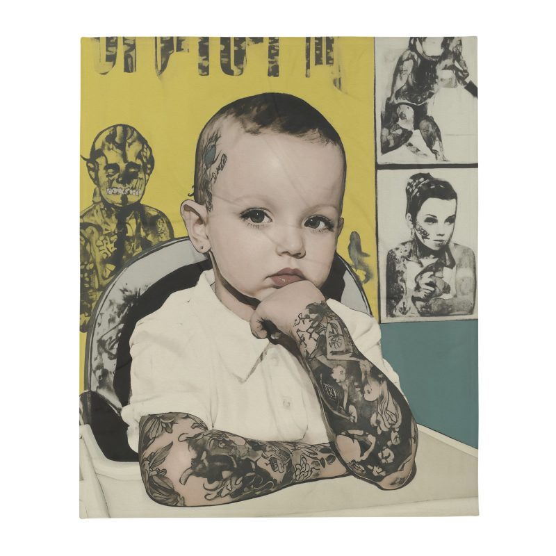 Snygg pläd med modern konst med ett tatuerat barn som dekoration på ena sidan. Materialet är 100% polyester i en otroligt mjuk och fin kvalitet. Pläden är både allergivänlig och tillverkad i ett brandsäkert material. Storleken är 127×153 cm. Baksidan är lika mjuk och skön som framsidan i en vit färg.