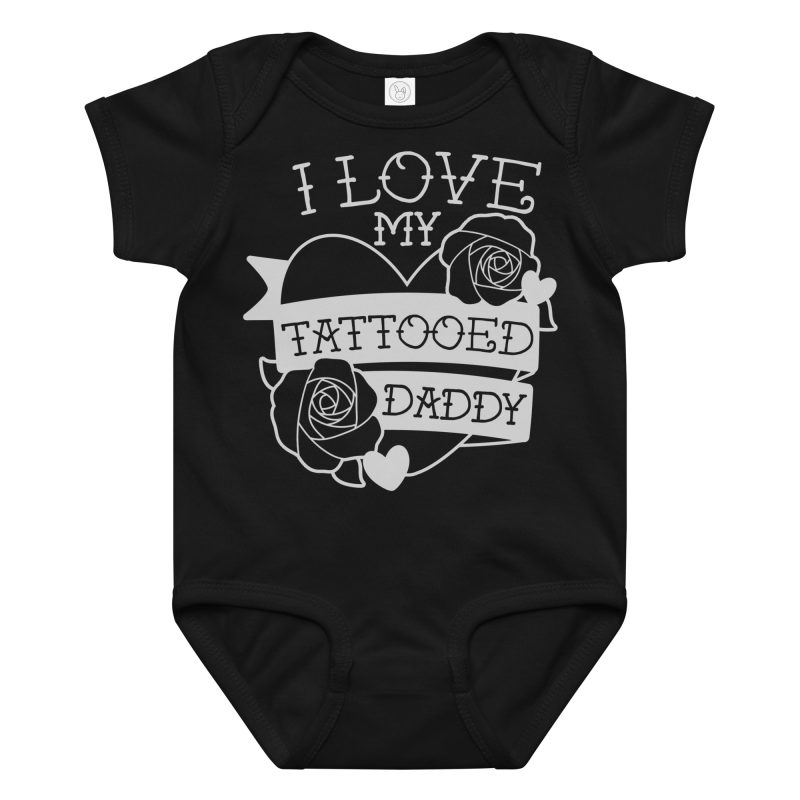 Riktigt söt body i svart med texten ’I love my tattooed daddy’ som dekoration på framsidan. Materialet är 100% ringspunnen bomull i en fin kvalitet. Passar alla barn med en tatuerad pappa.
