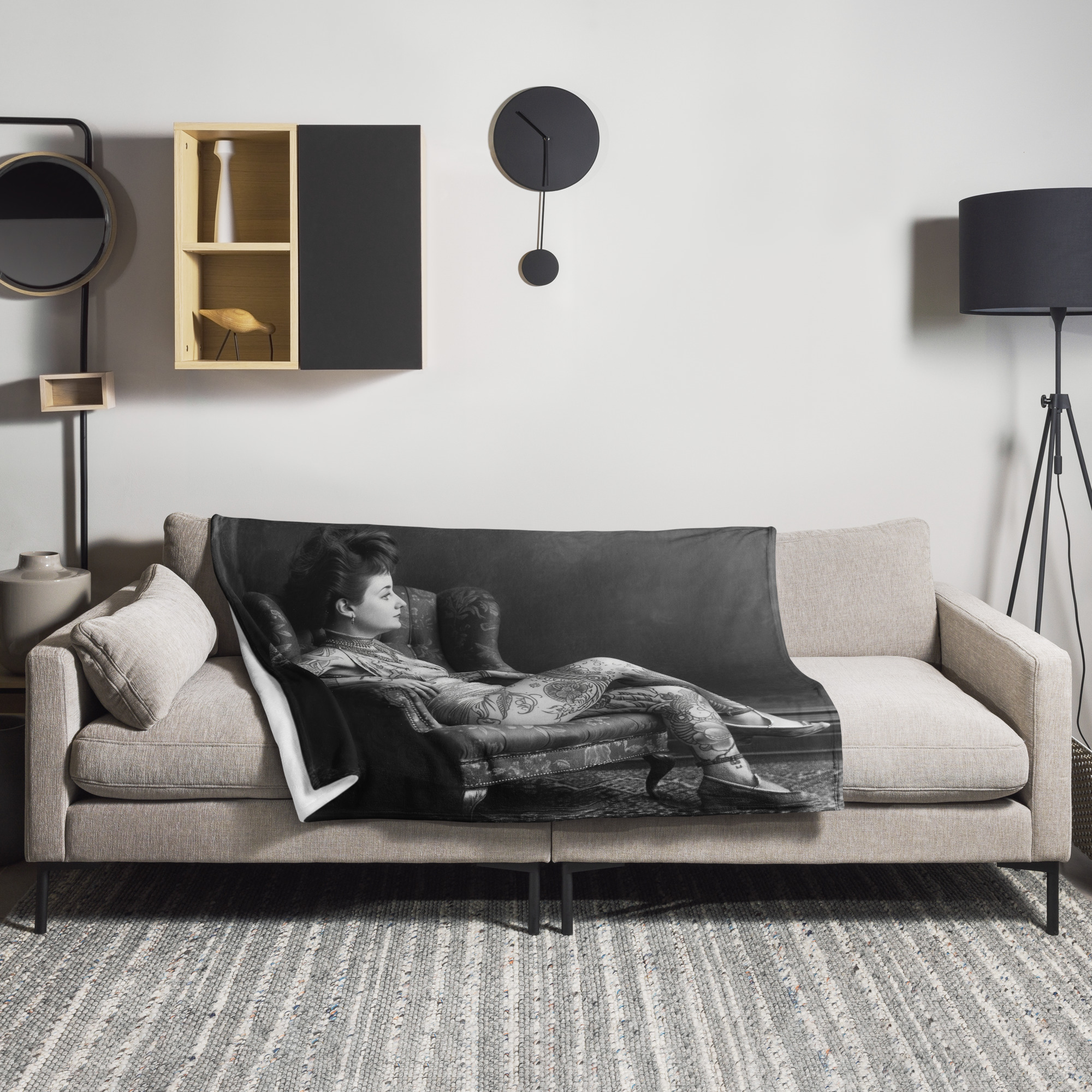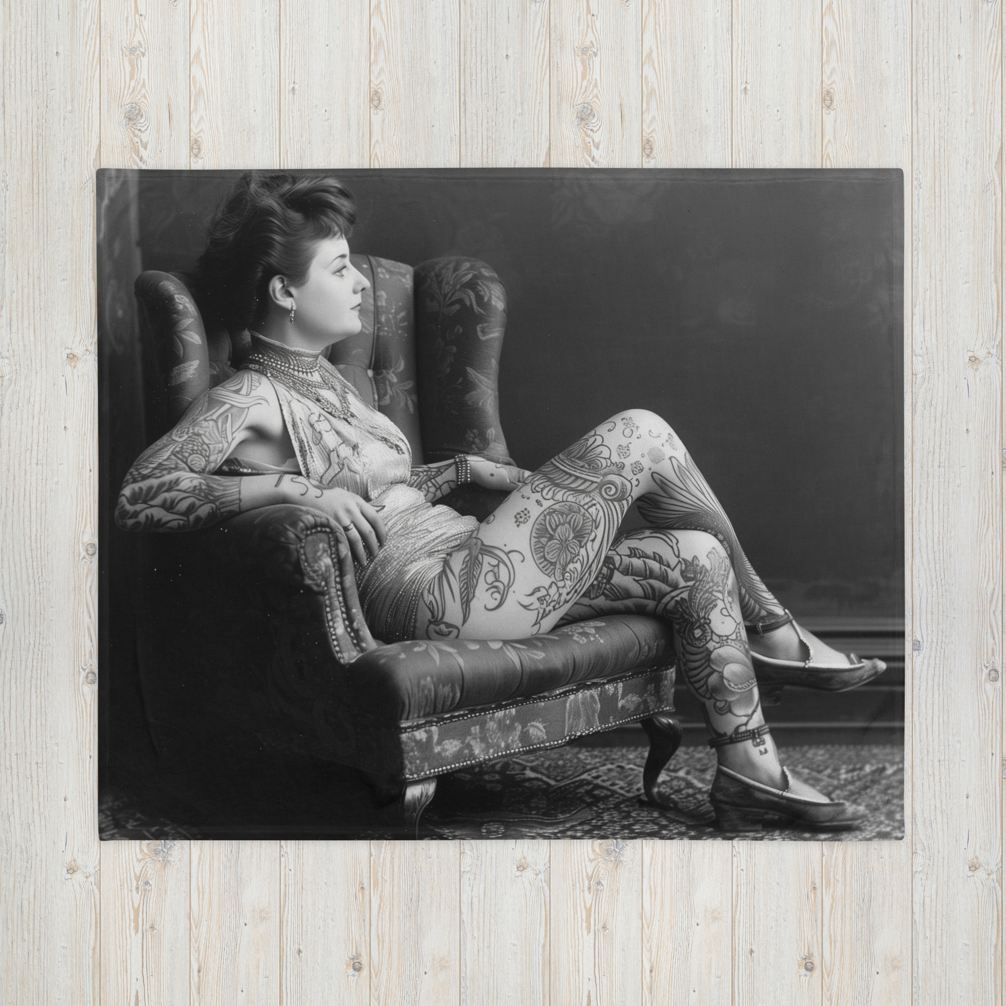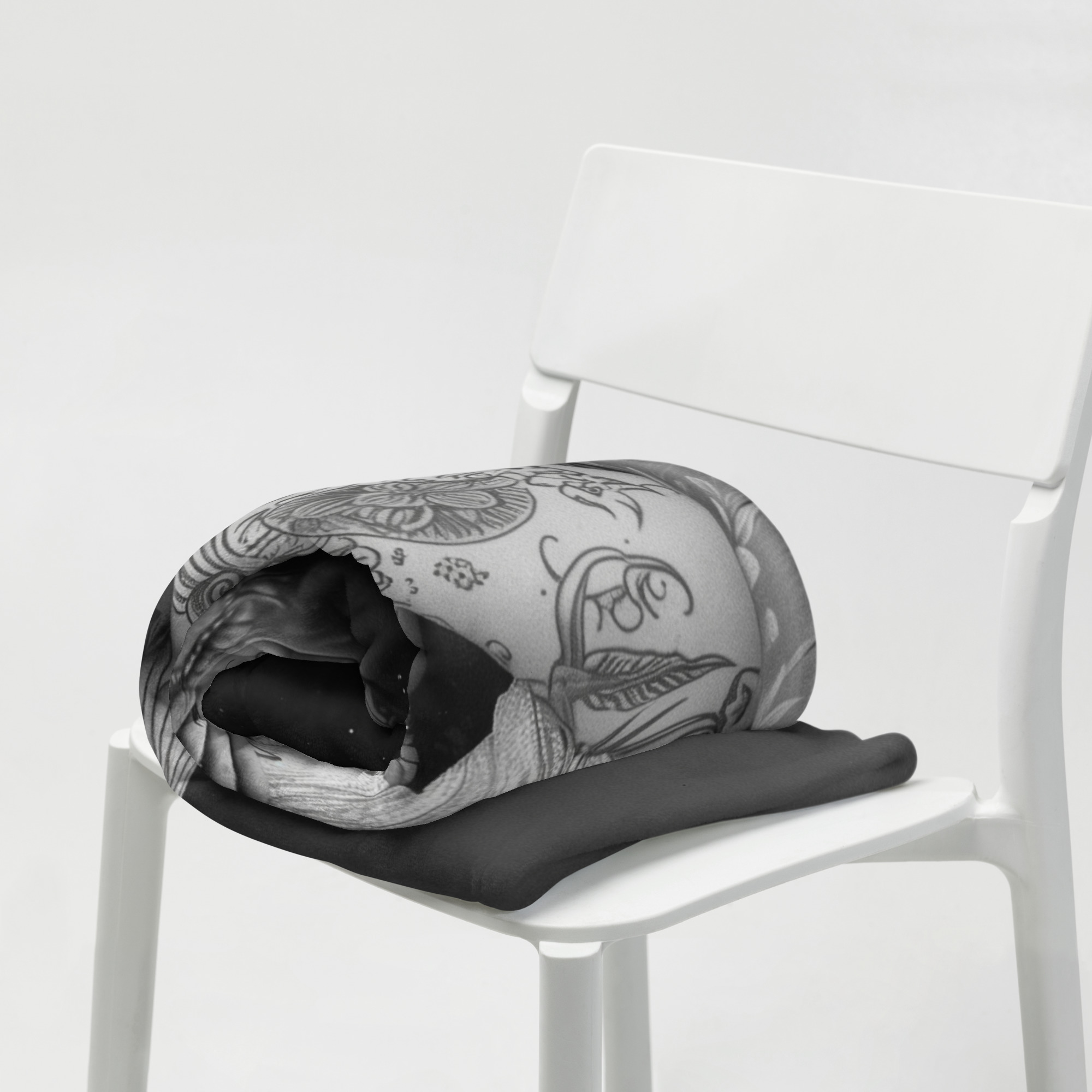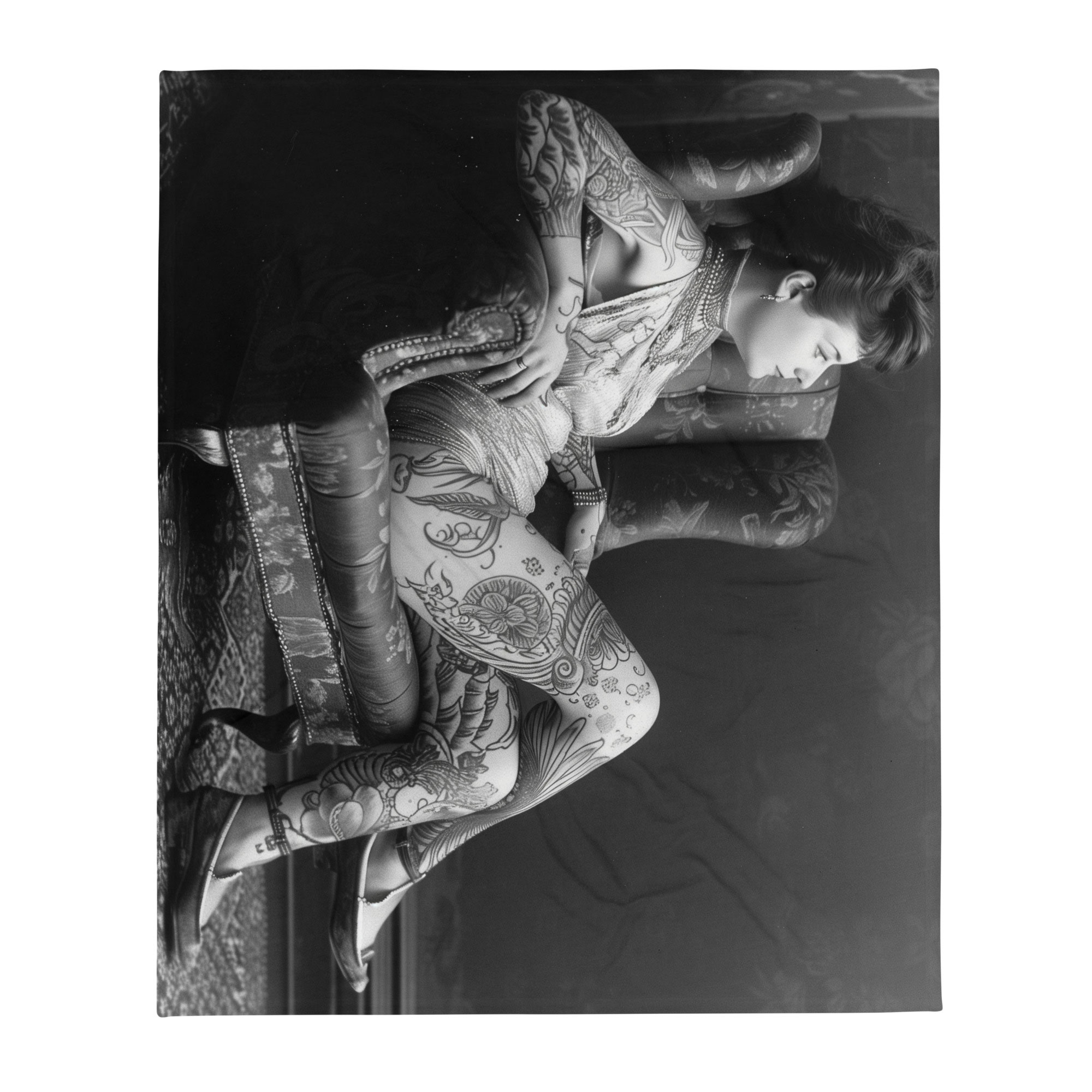 Snygg pläd med en tatuerad kvinna som dekoration på ena sidan. Materialet är 100% polyester i en otroligt mjuk och fin kvalitet. Pläden är både allergivänlig och tillverkad i ett brandsäkert material. Storleken är 127×153 cm. Baksidan är lika mjuk och skön som framsidan i en vit färg.