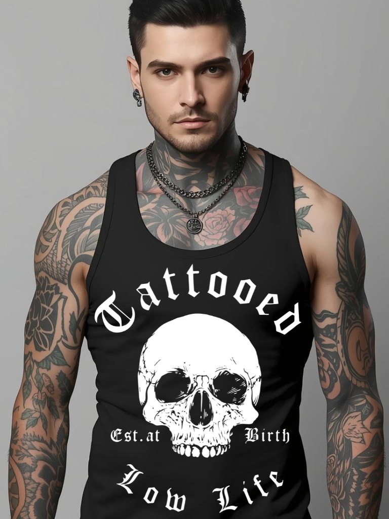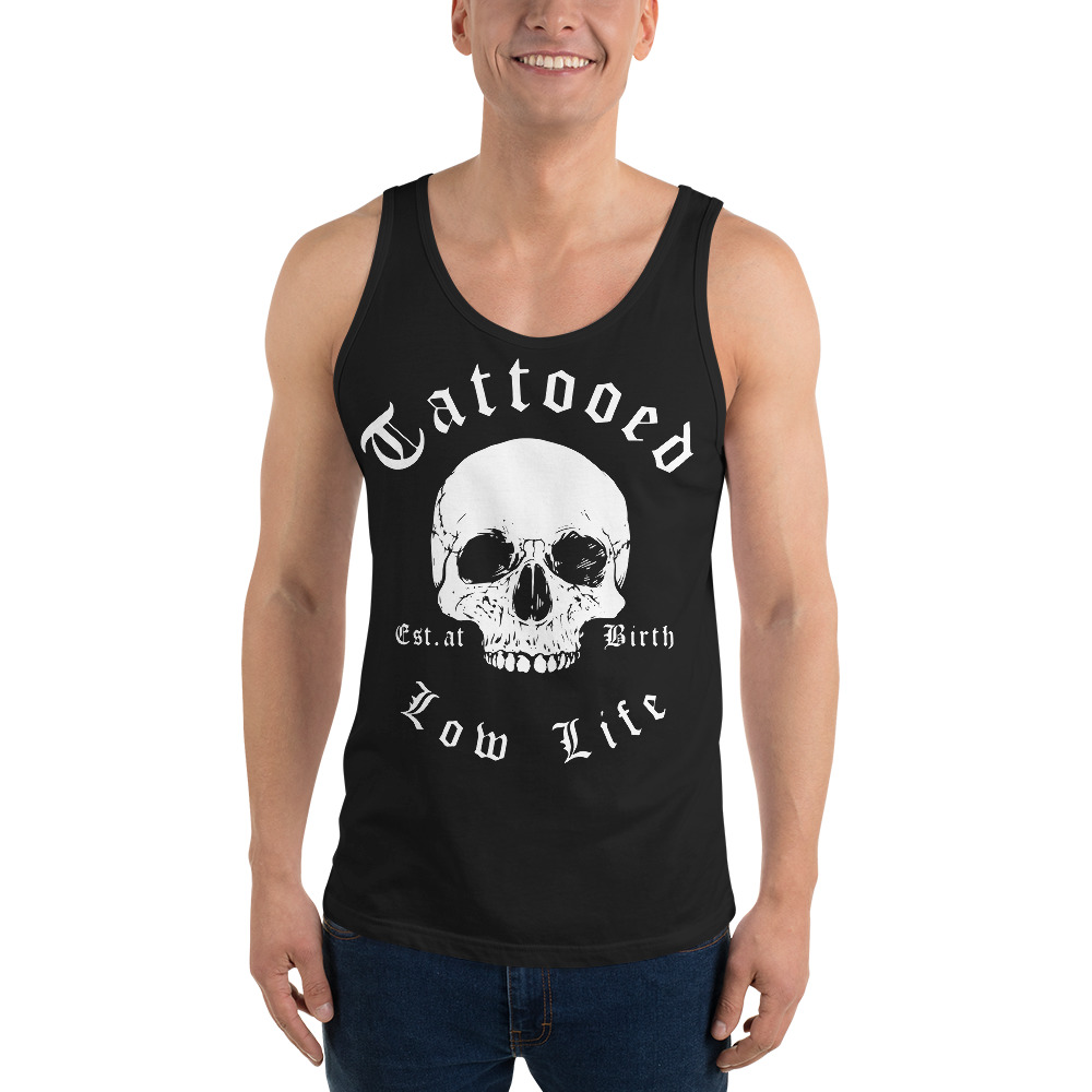 Linne i svart med en stor dödskalle och texten ’Tattooed low life’ som tryck på framsidan. Tillverkad i en skön kvalitet i 100% bomull. Passar perfekt till både män och kvinnor som är tatuerade low lifes.