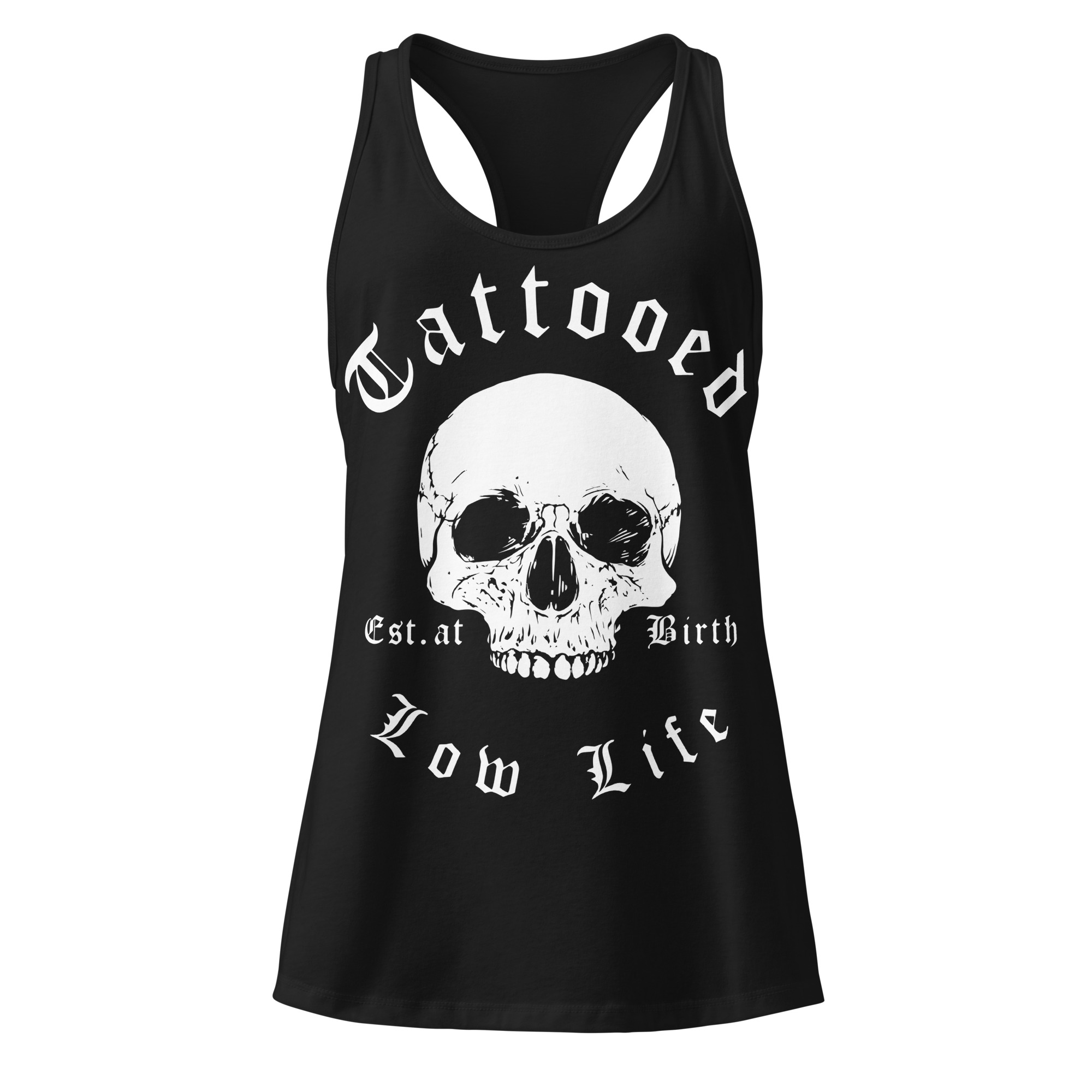 Snyggt linne i racerback-modell med en stor dödskalle och texten ’Tattooed low life’ som dekoration på framsidan. Linnet är tillverkat i jersey i lättvikt för att följa kroppen perfekt. Materialet är mycket stretchigt och kommer bli din nya favorit.