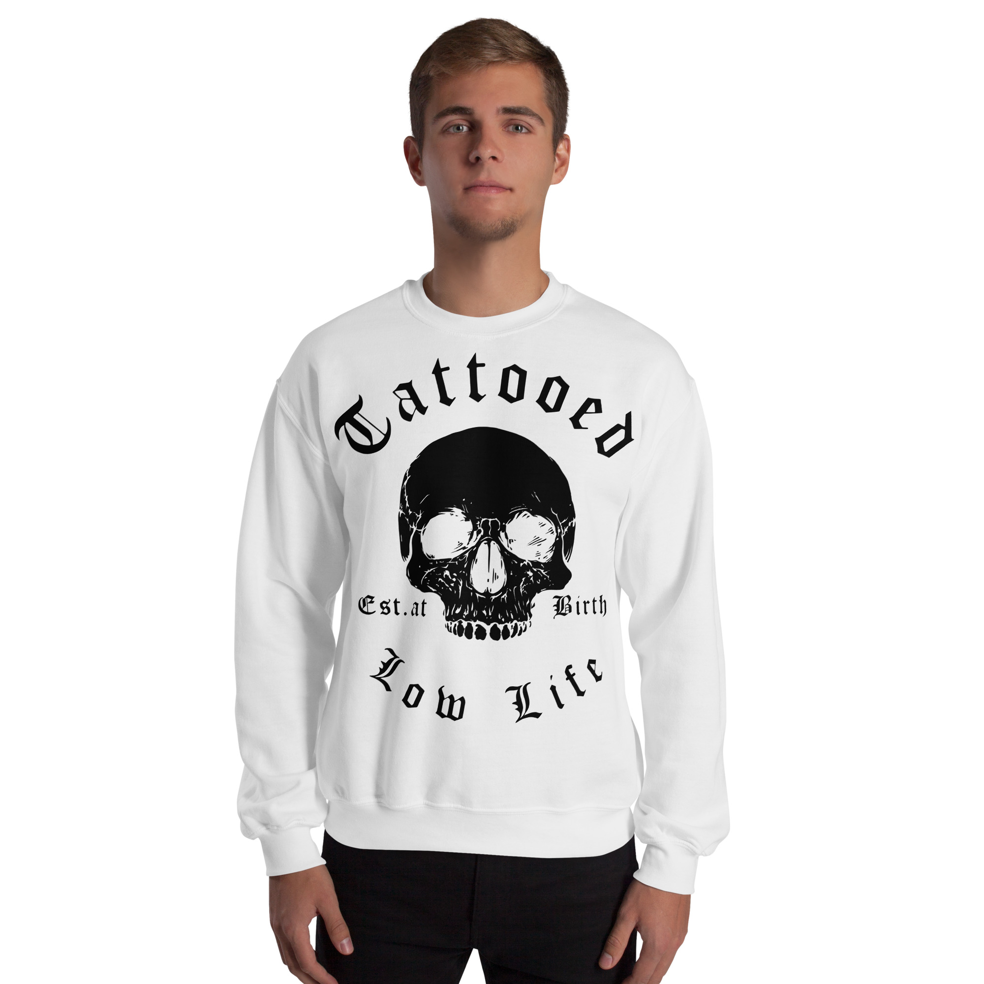 Varm och skön sweatshirt i vitt tillverkad i blandad bomull/polyester med ett stort tryck med en dödskalle och texten ’Tattooed low life’ som dekoration på framsidan. Tröjan passar perfekt till både män och kvinnor som älskar den alternativa stilen.