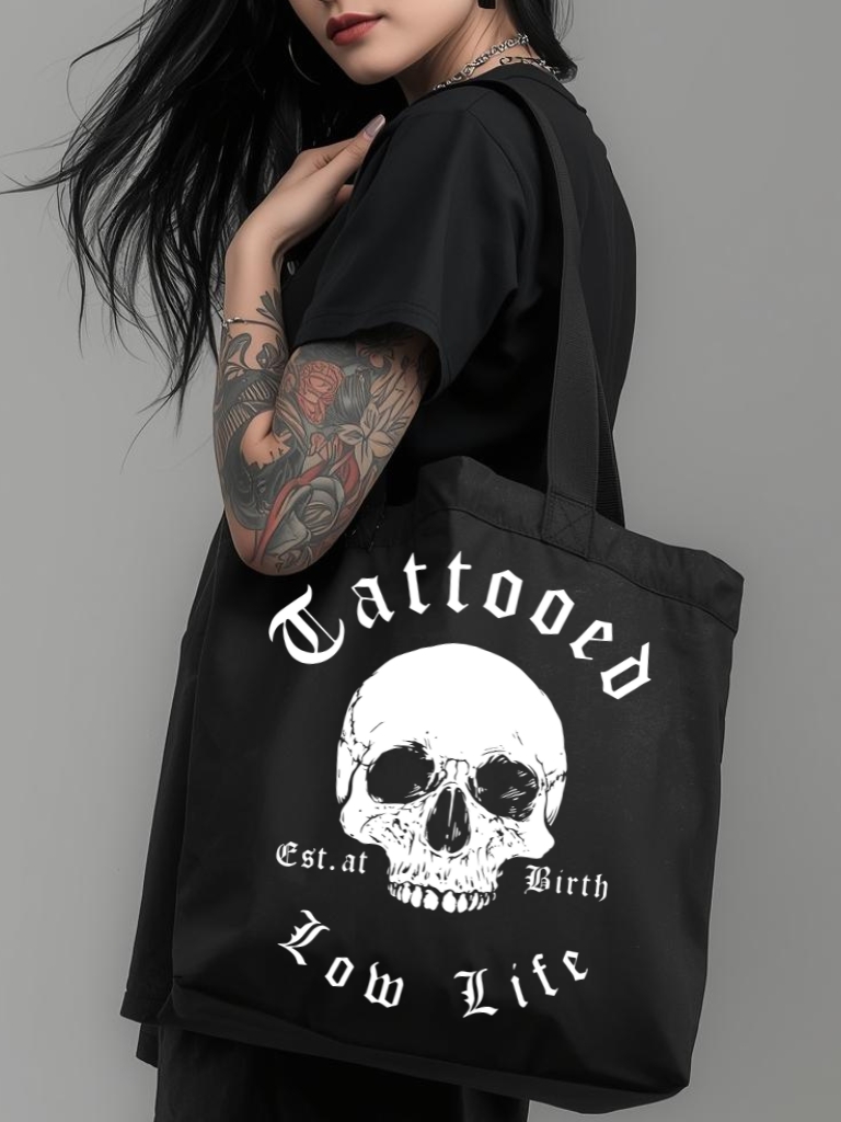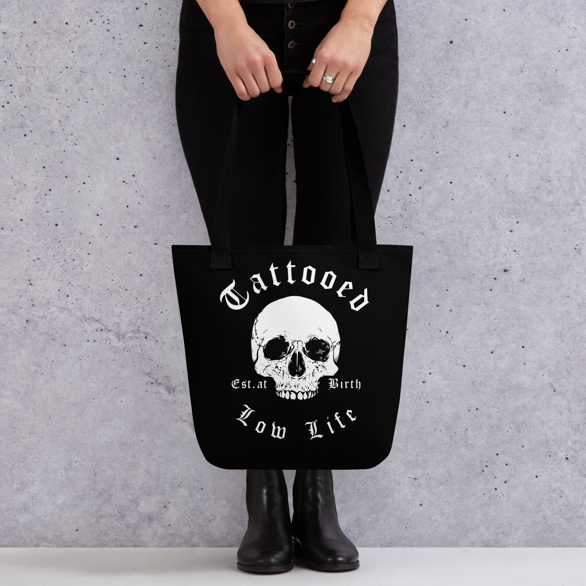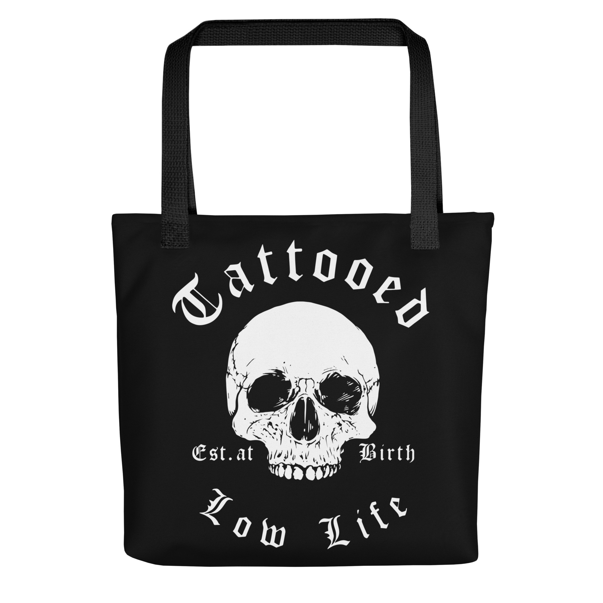 Snygg väska med en stor dödskalle och texten ’Tattooed low life’ som tryck på båda sidorna. Väskan är tillverkad i en fin kvalitet i 100% polyester med en storlek på 39×39 cm. Väskan trycks och sys sedan ihop för hand exklusivt efter din beställning och skickas till dig direkt från leverantören.