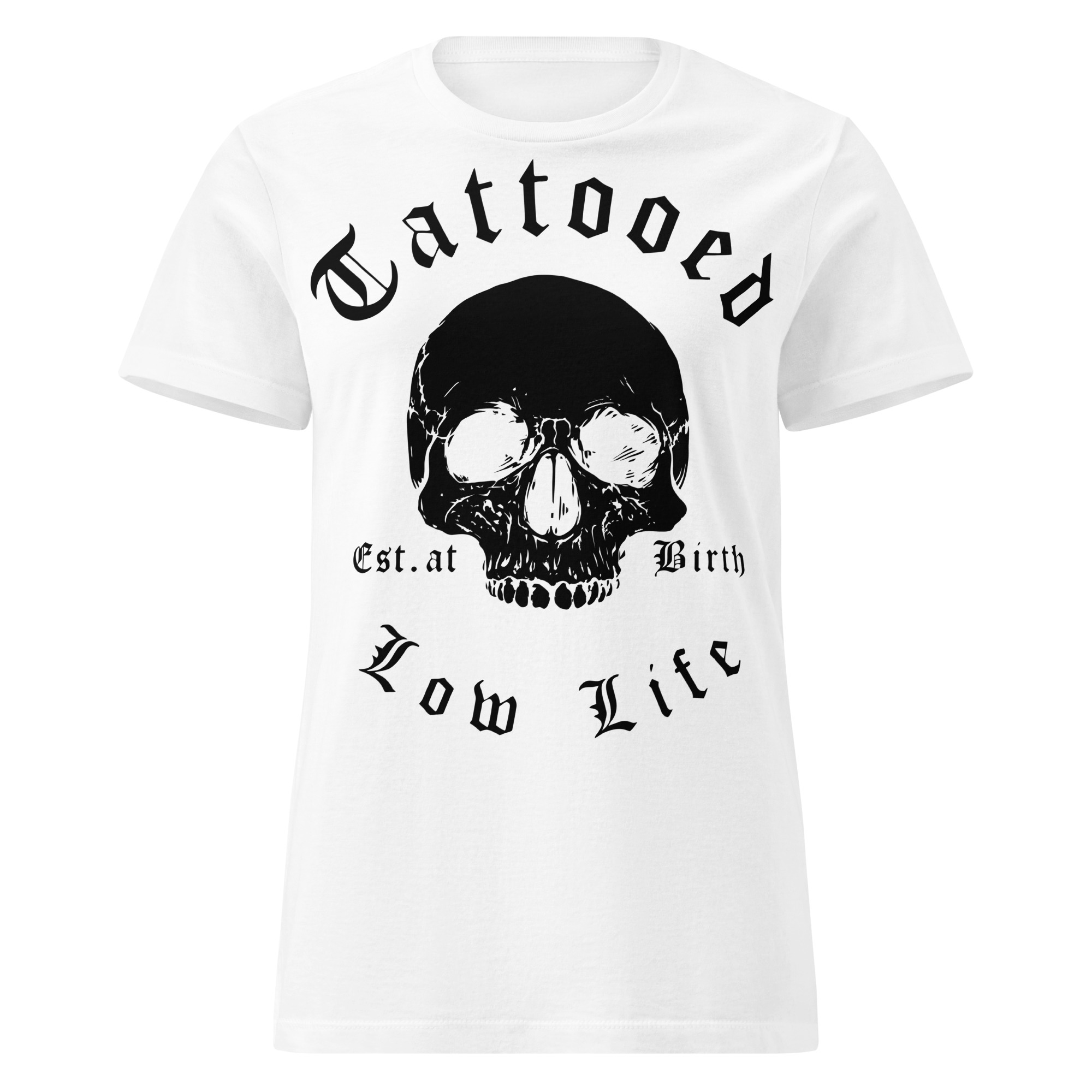 Semi-fitted t-shirt i vitt med en stor dödskalle och texten ’Tattooed low life’ som dekoration på framsidan. Passar perfekt till kvinnor, materialet är mjuk bomull.