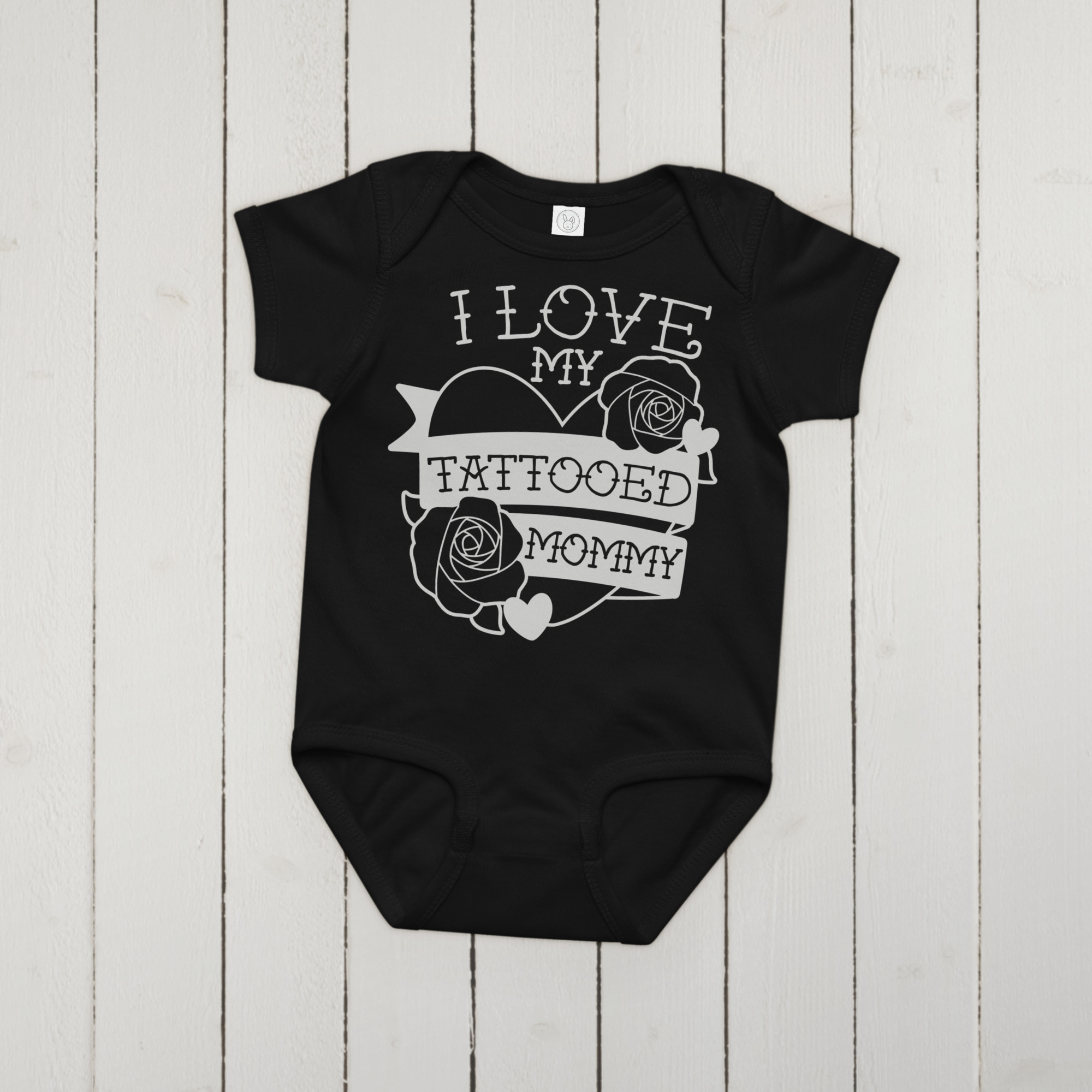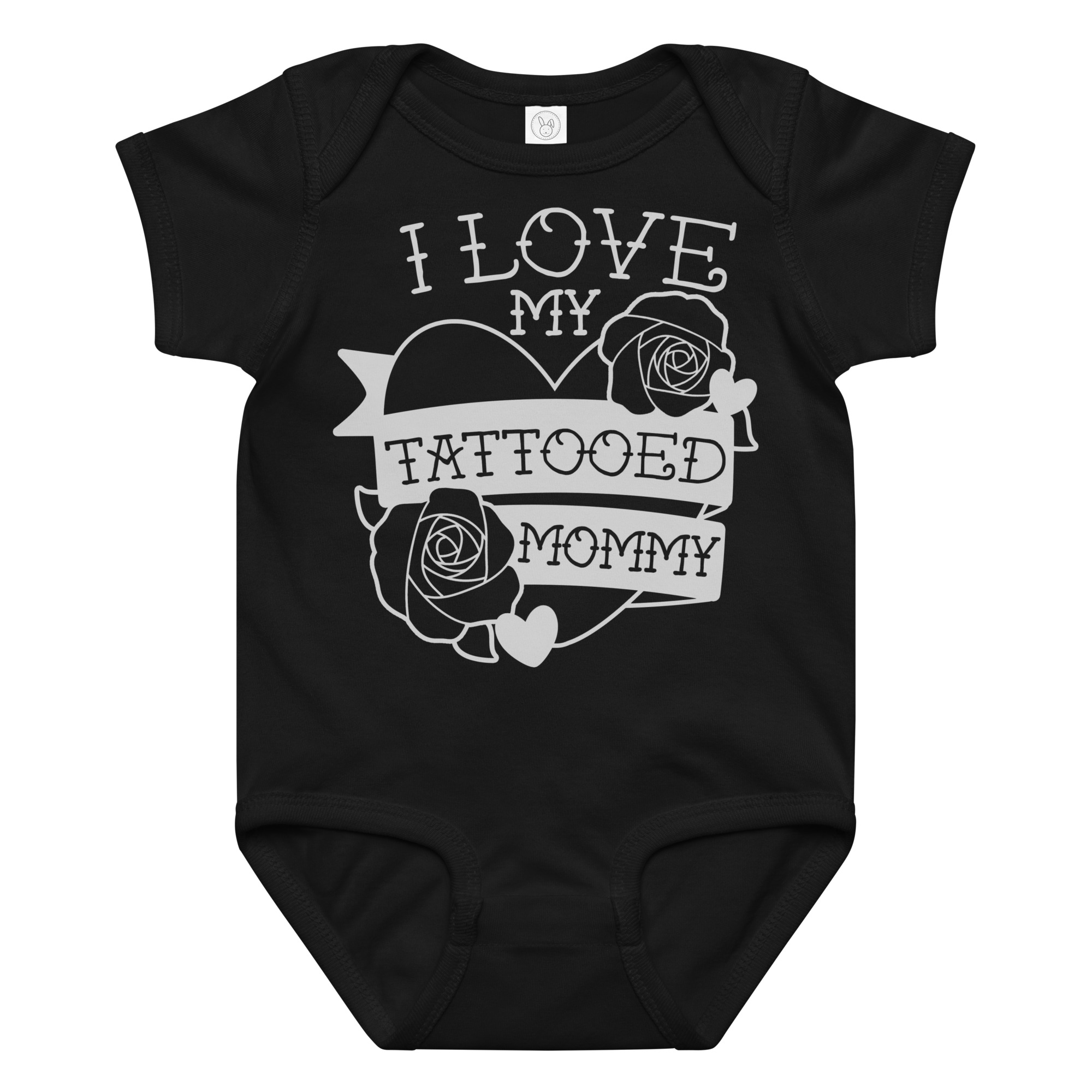 Riktigt söt body i svart med texten ’I love my tattooed mommy’ som dekoration på framsidan. Materialet är 100% ringspunnen bomull i en fin kvalitet. Passar alla barn med en taturead mamma.