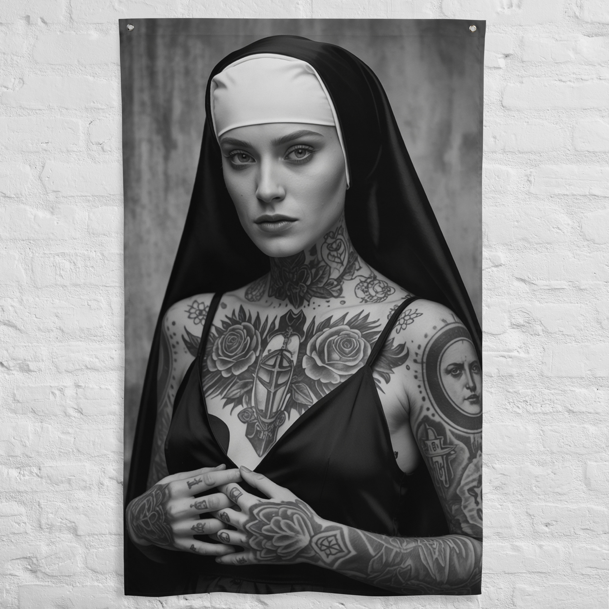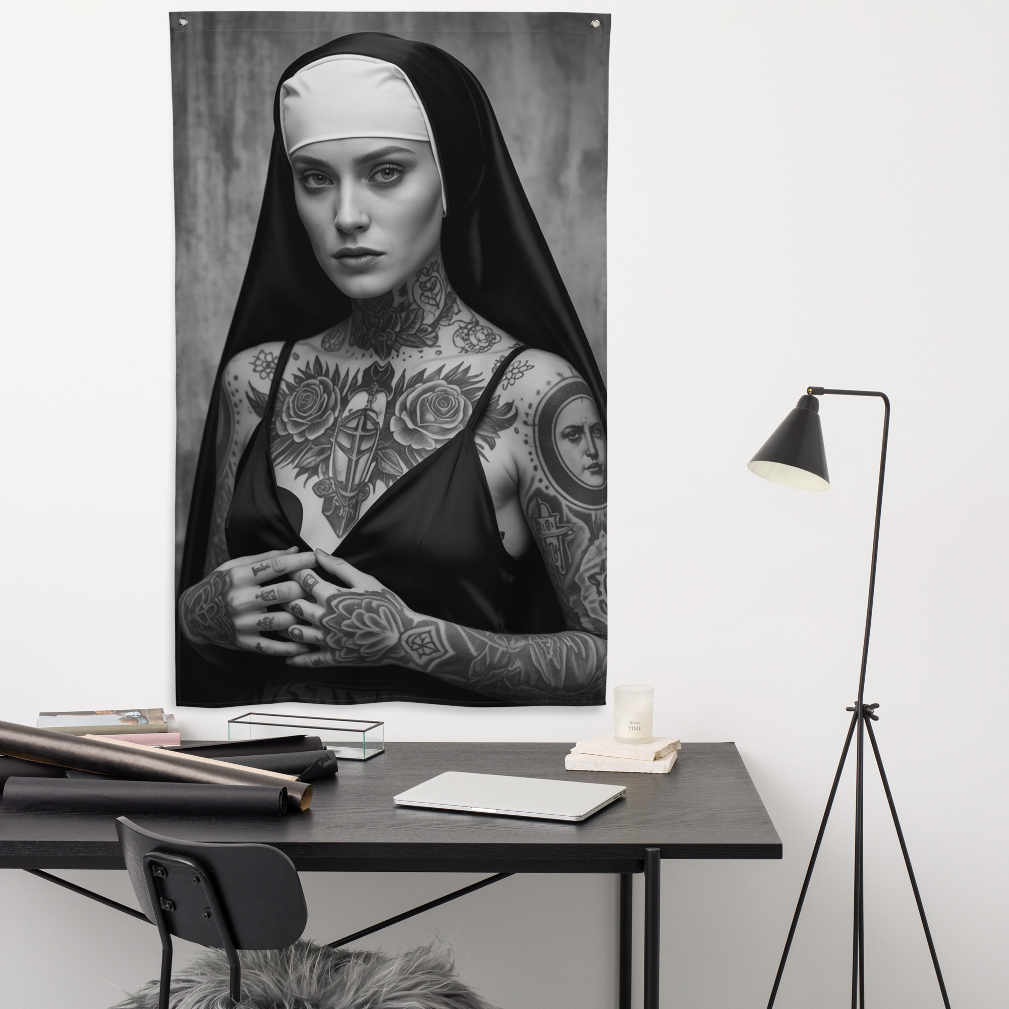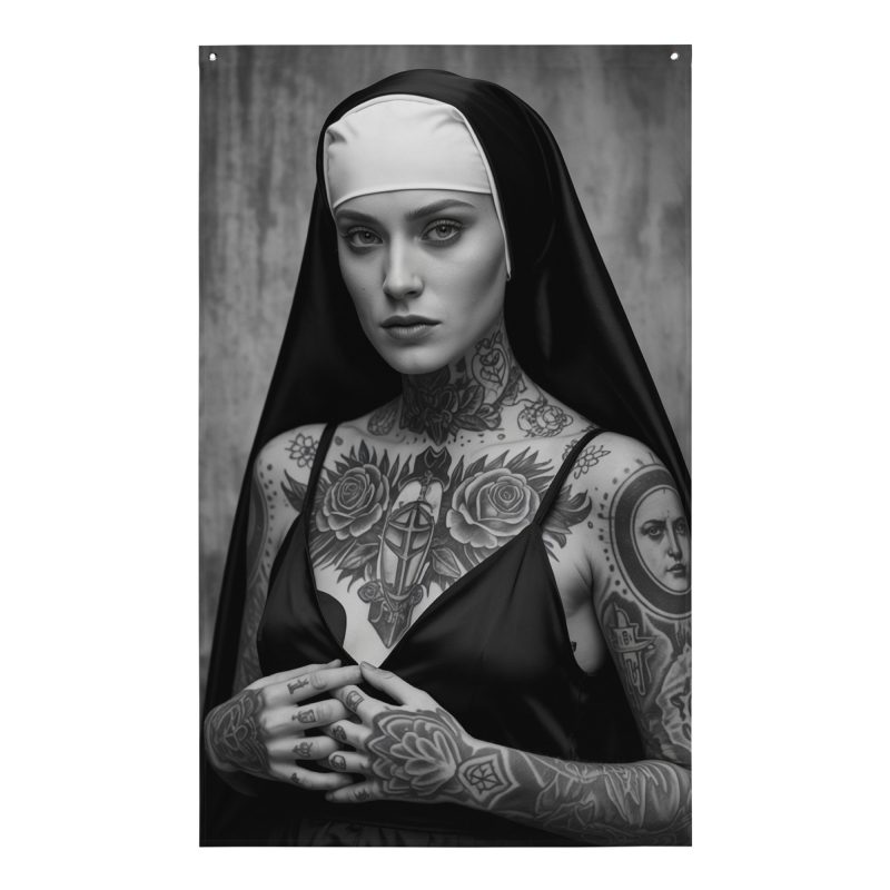 Otroligt snygg väggdekoration tillverkad i 100% polyester med en tatuerad nunna som tryck. Två silverfärgade öljetter i ena sidan gör att den lätt går att fästa på väggen. Storleken är hela 142×87 cm, så den kommer verkligen att sticka ut där du placerar den.