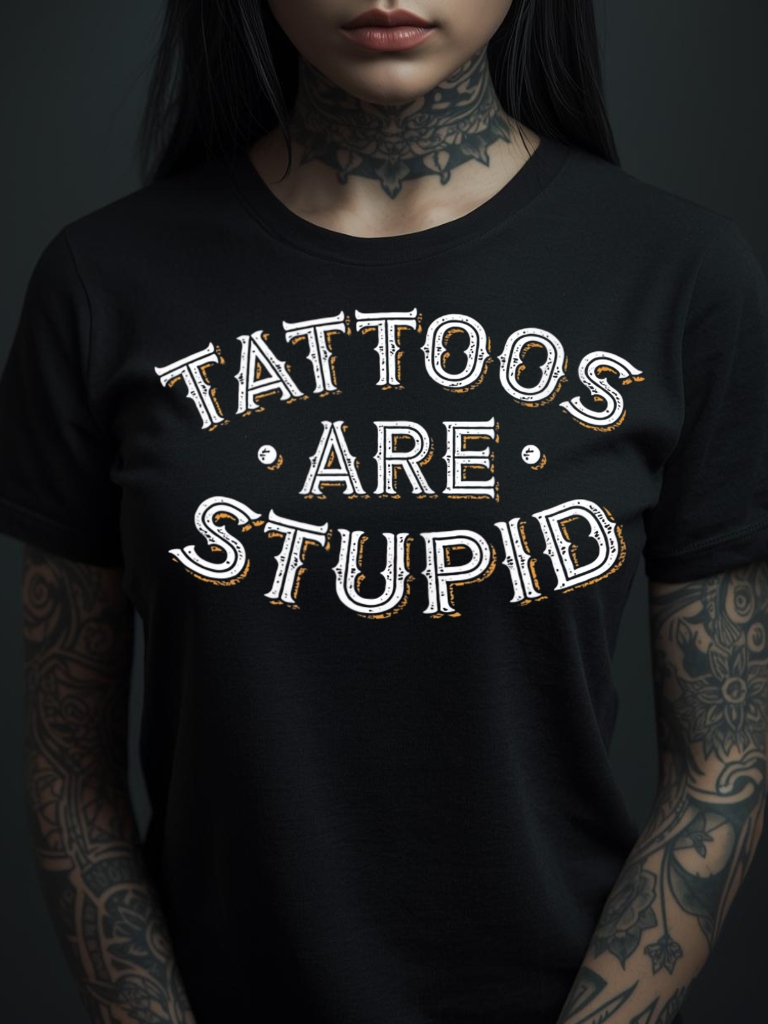 Semi-fitted t-shirt i svart med ett retroinspirerat tryck med texten ’Tattoos are stupid’ som dekoration på framsidan. Passar perfekt till kvinnor som tycker att tatueringar är idiotiskt. Tröjan är tillverkad i en supermjuk kvalitet i 100% bomull.