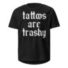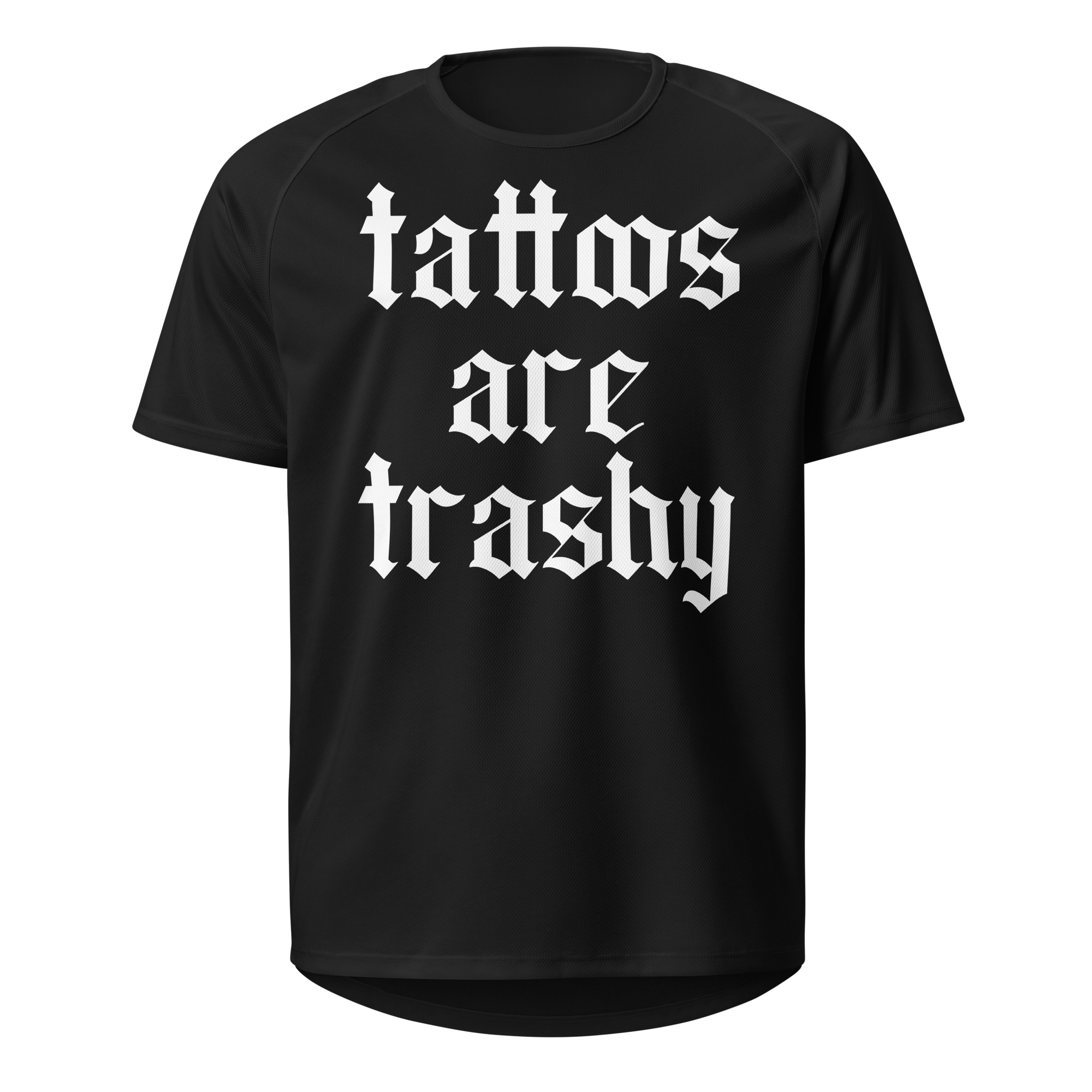 Snygg jersey-tröja med korta ärmar tillverkad i polyester som andas och håller dig fräsch även varma dagar och vid träning. Framsidan är dekorerad med texten ’Tattoos are trashy’. Tröjan har ”relaxed” passform och lite längre längd. Passar perfekt till både kvinnor och män.