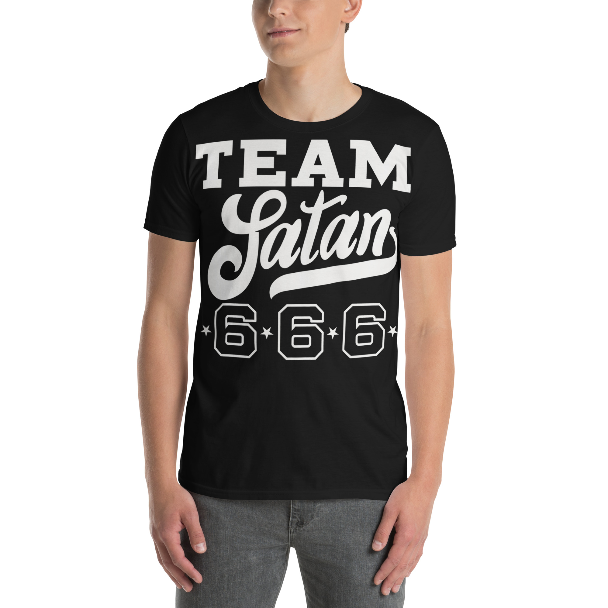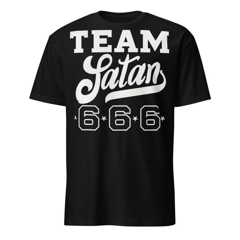 T-shirt i svart med texten ’Team Satan 666’ som dekoration på framsidan. Passar perfekt till kvinnor och män som älskar den alternativa klädstilen. Tröjan är tillverkad i en supermjuk kvalitet i 100% bomull.