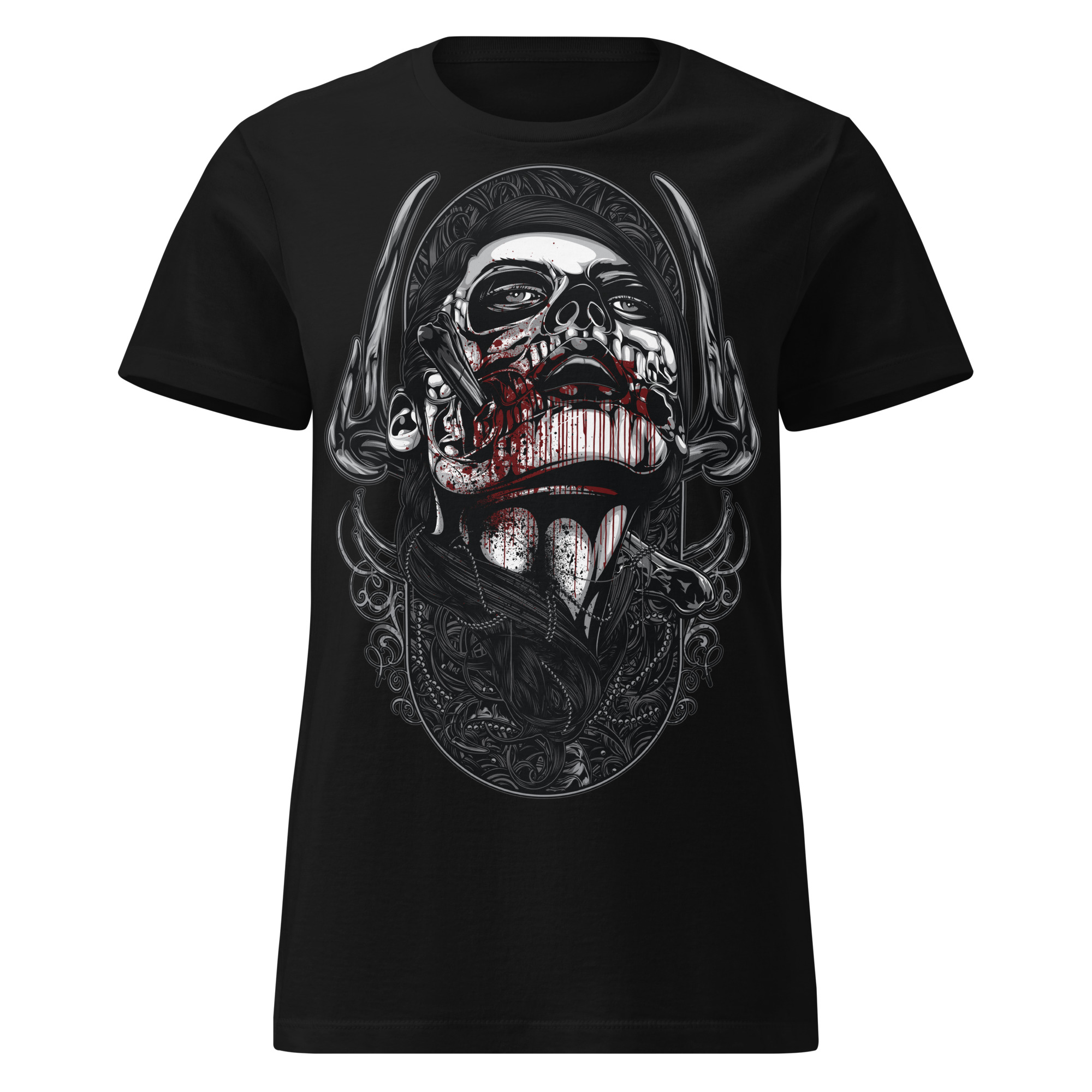 Semi-fitted t-shirt i svart med ett stort alternativt tryck som dekoration på framsidan. Passar perfekt till kvinnor som älskar den alternativa stilen. Tröjan är tillverkad i en fin kvalitet i 100% bomull.