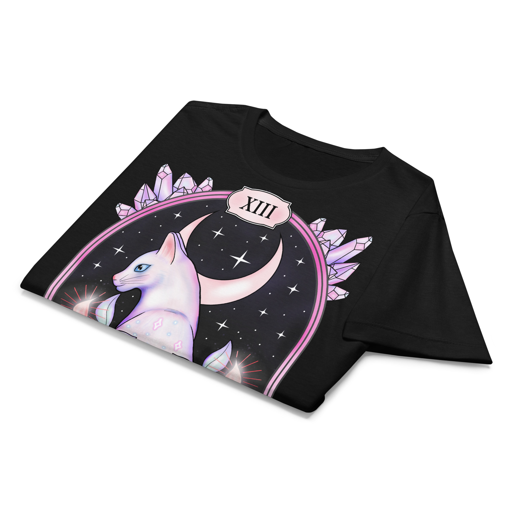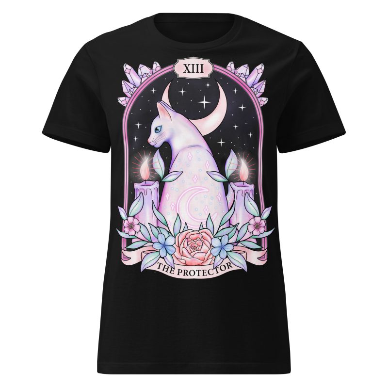 Semi-fitted t-shirt i svart med ett pastellfärgat tarot-motiv med en sphynx-katt och texten ’The protector’ som dekoration på framsidan. Passar perfekt till kvinnor som älskar den alternativa stilen. Tröjan är tillverkad i en supermjuk kvalitet i 100% bomull.