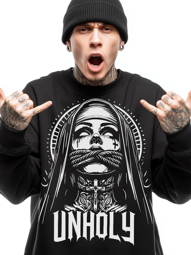Varm och skön sweatshirt i svart tillverkad i blandad bomull/polyester med en nunna och texten ’Unholy’ som dekoration på framsidan. Unisex-modell som passar perfekt till både män och kvinnor som älskar den alternativa stilen.