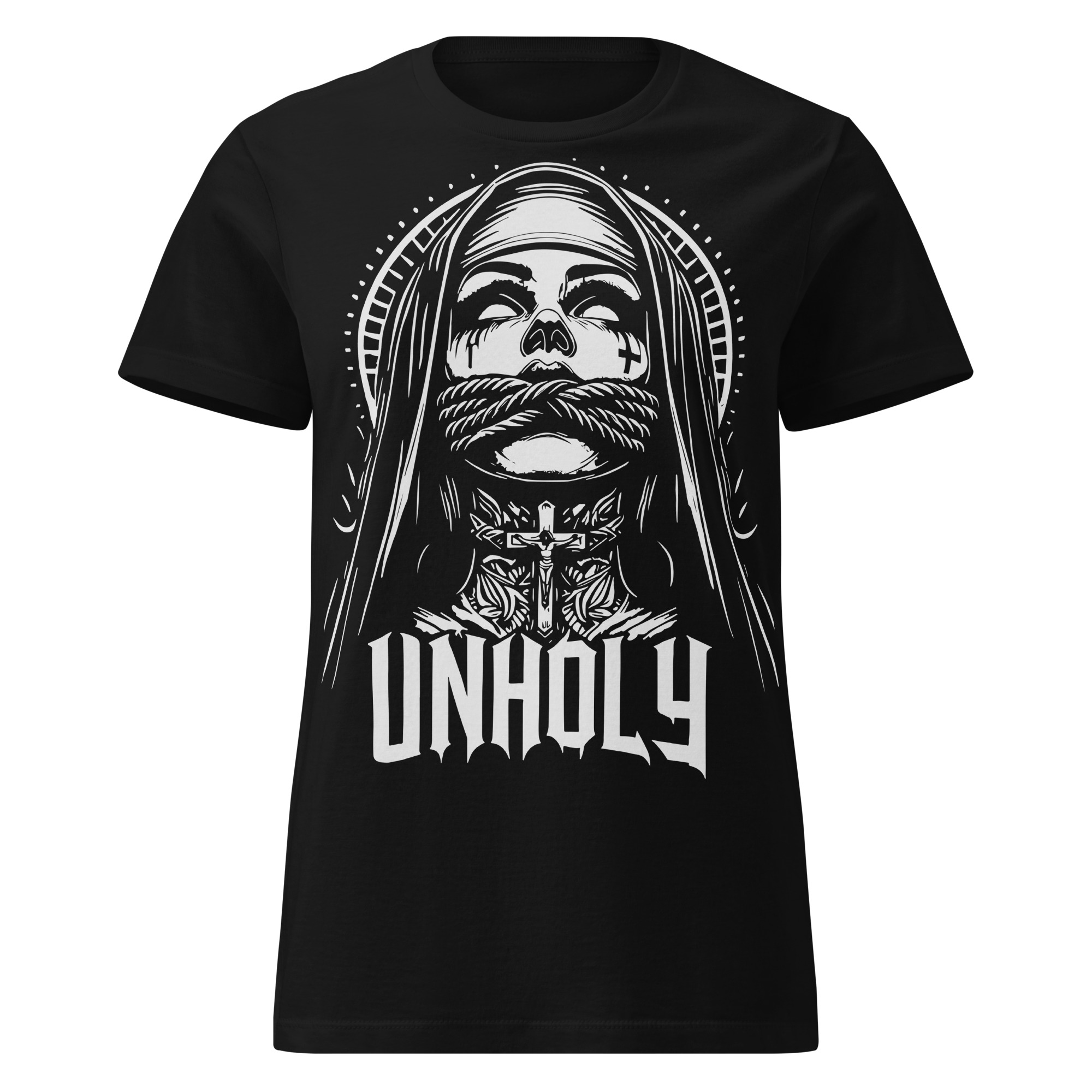 Semi-fitted t-shirt i svart med en nunna och texten ’Unholy’ som dekoration på framsidan. Passar perfekt till kvinnor som älskar den alternativa klädstilen. Tröjan är tillverkad i en supermjuk kvalitet i 100% bomull.