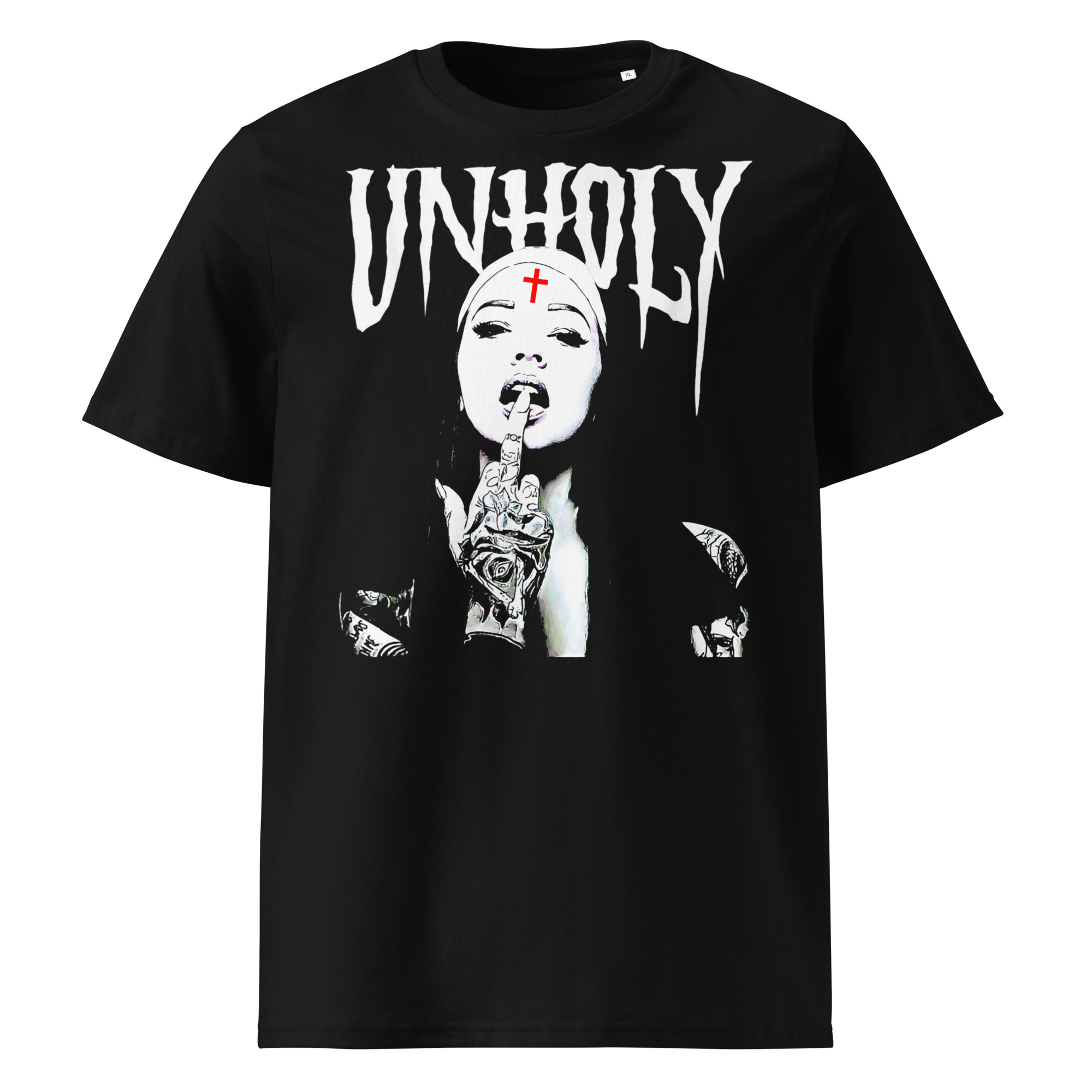 T-shirt i svart med en nunna med attityd och texten ’Unholy’ som dekoration på framsidan. Passar perfekt till både män och kvinnor som älskar den alternativa stilen. Tröjan är tillverkad i en superfin kvalitet i organisk bomull.