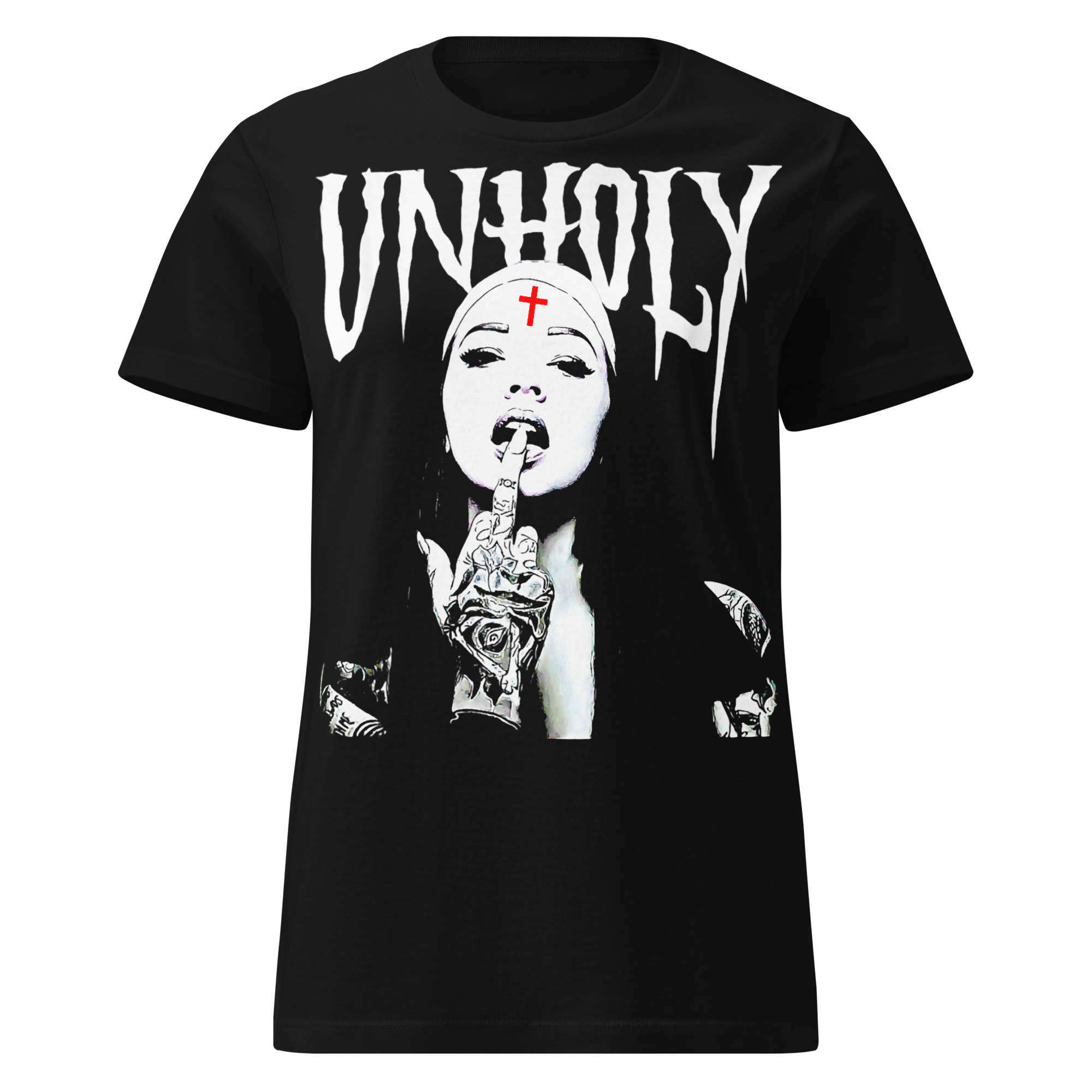 Semi-fitted t-shirt i svart med en nunna med attityd och texten ’Unholy’ som dekoration på framsidan. Passar perfekt till kvinnor som älskar den alternativa stilen. Tröjan är tillverkad i en fin kvalitet i 100% bomull.