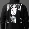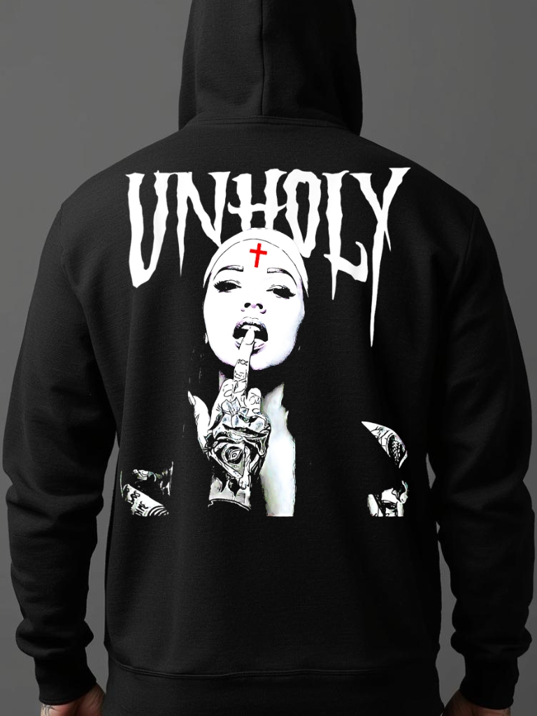 Hoodie med dragkedja och ett stort tryck på ryggen. Trycket är dekorerat med en nunna med attityd och texten ’Unholy’. Passar perfekt till både män och kvinnor, materialet är blandad bomull och polyester.