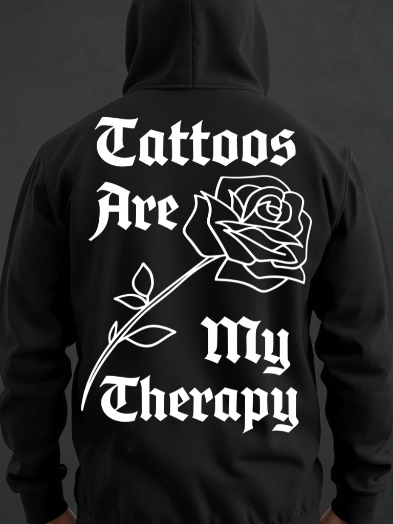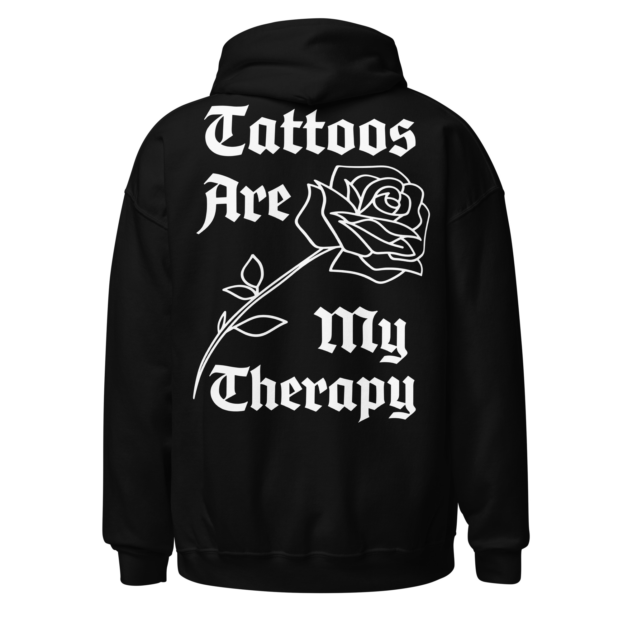 Hoodie i unisex-modell tillverkad i en extra fin kvalitet i blandad bomull och polyester. På baksidan återfinns en stor tatueringsinspirerad ros och texten ’Tattoos are my therapy’ som dekoration. Hoodien håller värmen riktigt bra och har ett otroligt mjukt tyg.