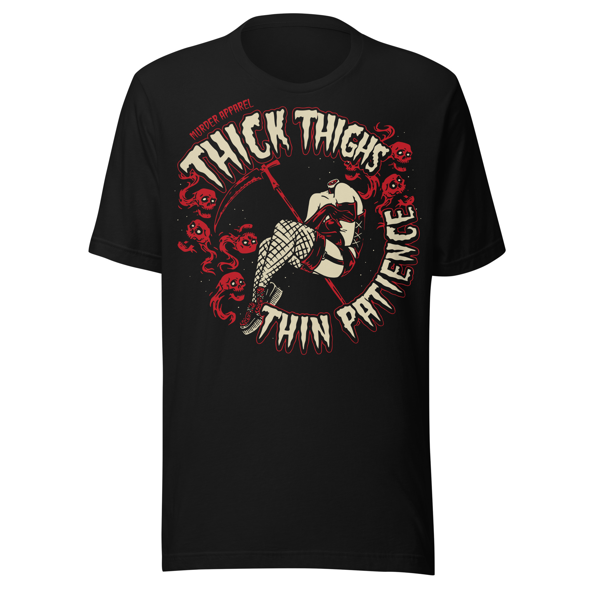 T-shirt i svart med ett stort alternativt tryck med texten ’Thick thighs, thin patience’ som dekoration på framsidan. Passar perfekt till kvinnor och män som älskar alternativa kläder. Tröjan är tillverkad i en supermjuk kvalitet i 100% bomull. Storleken är 2XL, sista exet.