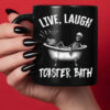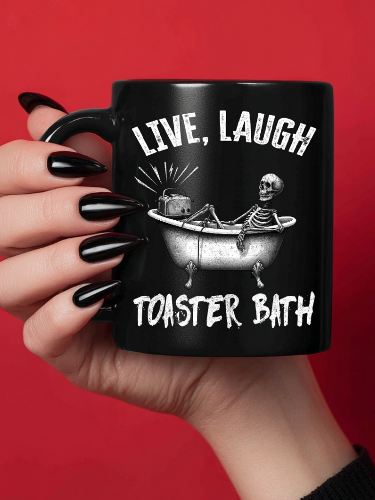 Mugg i svart med ett skelett i sitt badkar med en brödrost och texten ’Live, laugh, toaster bath’ som motiv på båda sidorna. Muggen är tillverkad i keramik och tål både maskindisk och uppvärmning i mikrovågsugn.