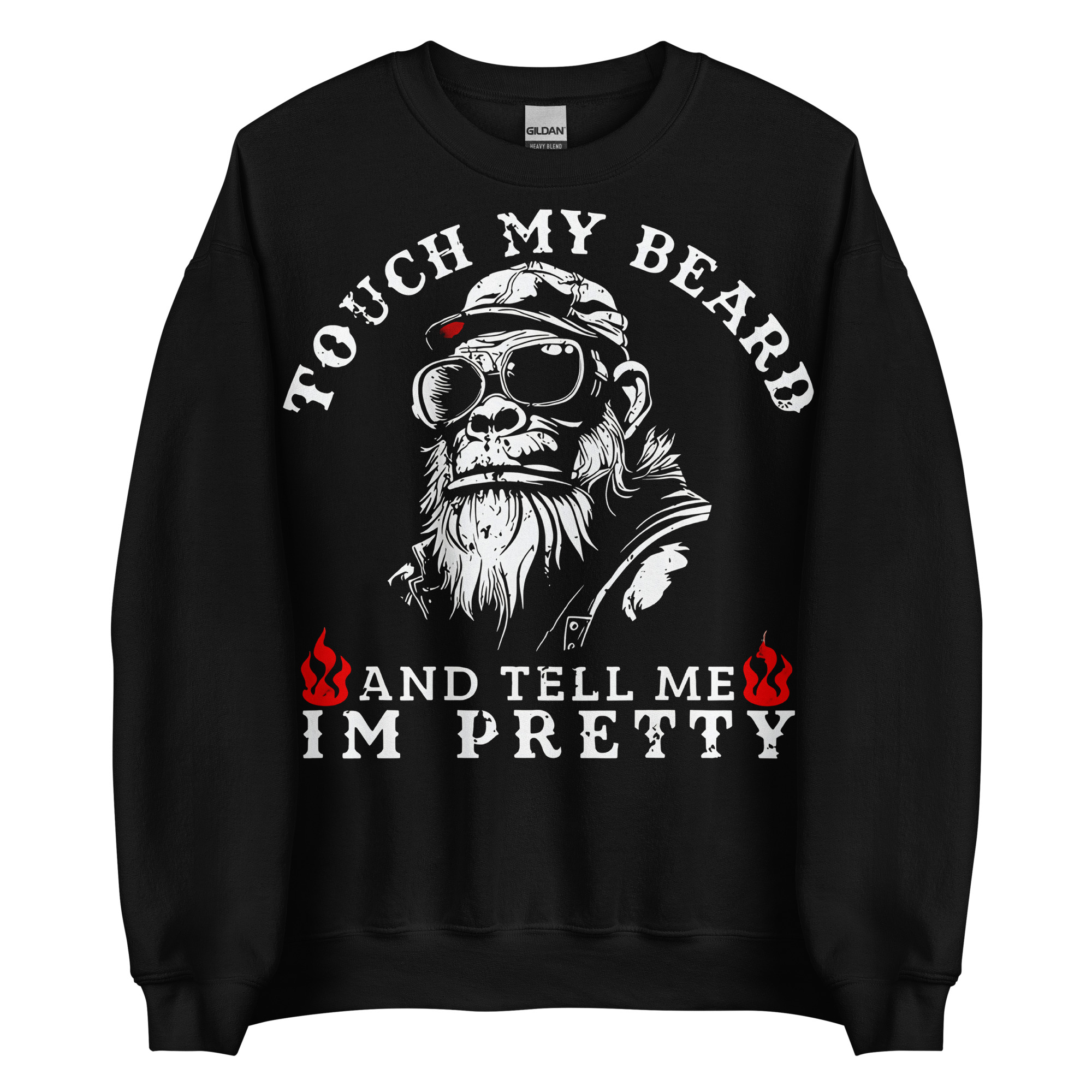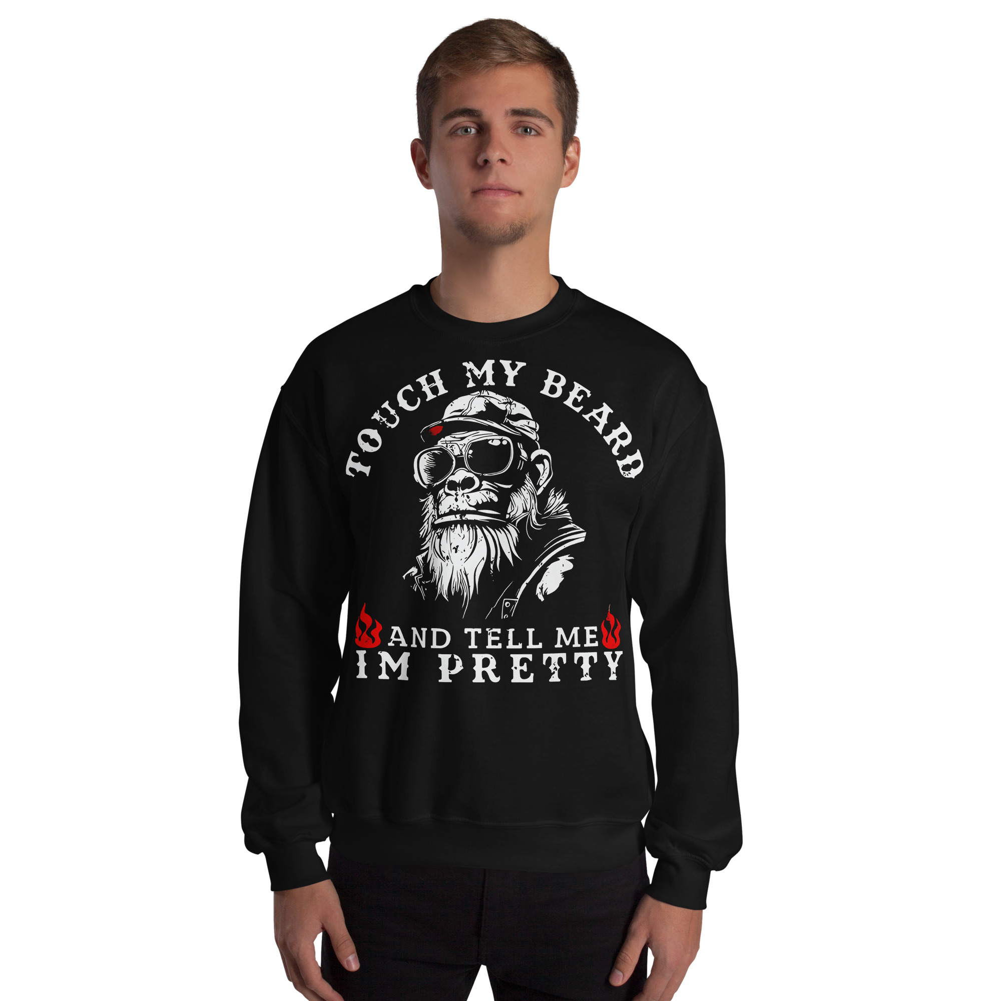 Varm och skön sweatshirt i svart tillverkad i blandad bomull/polyester med ett stort tryck med en skäggig apa och texten ’Touch my beard and tell me I’m pretty’ som dekoration på framsidan. Tröjan passar perfekt till alla skäggiga män.