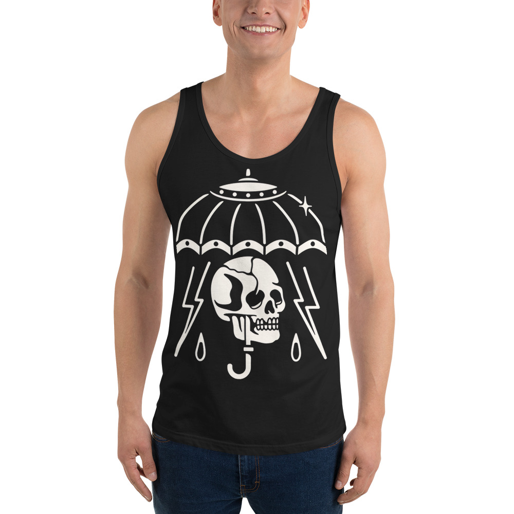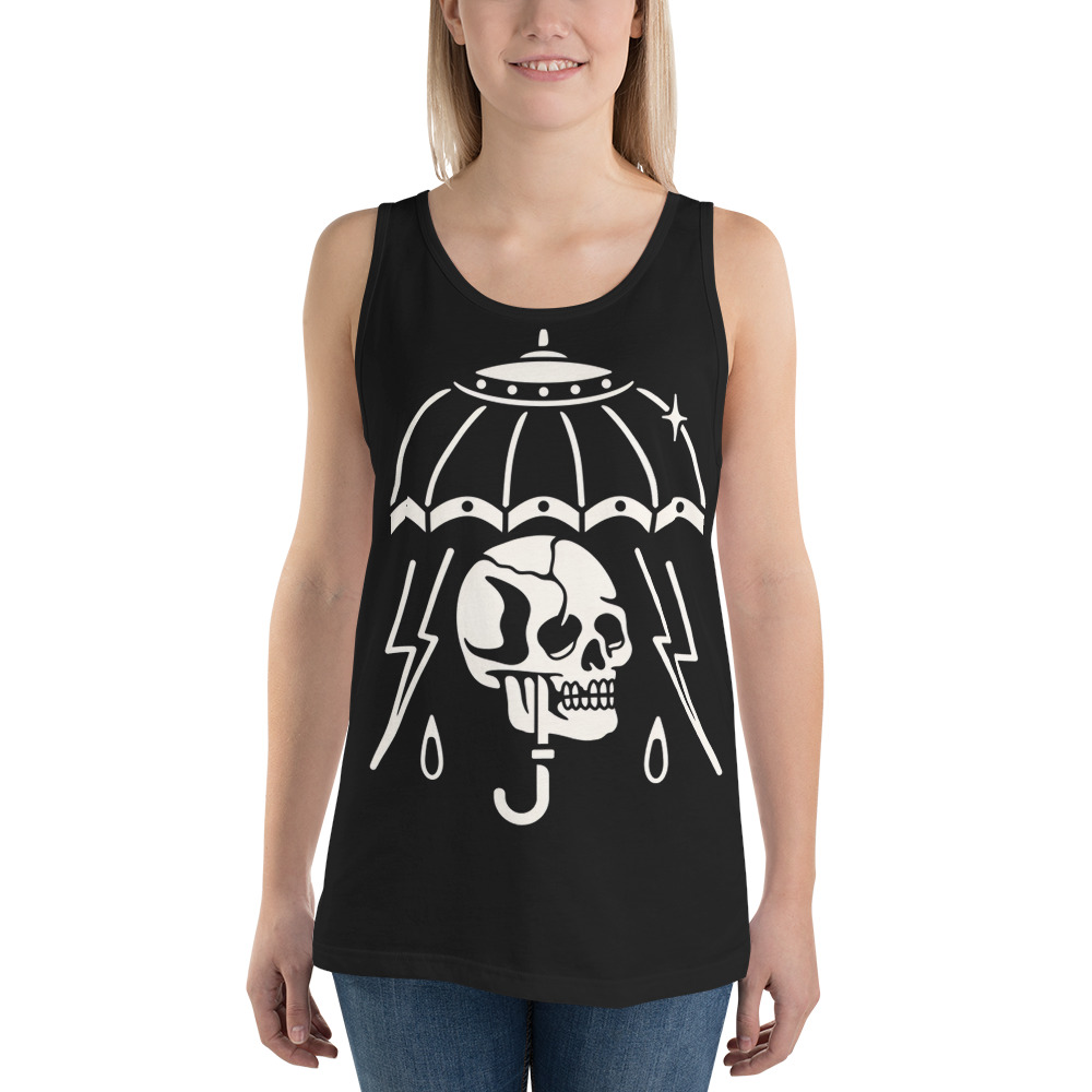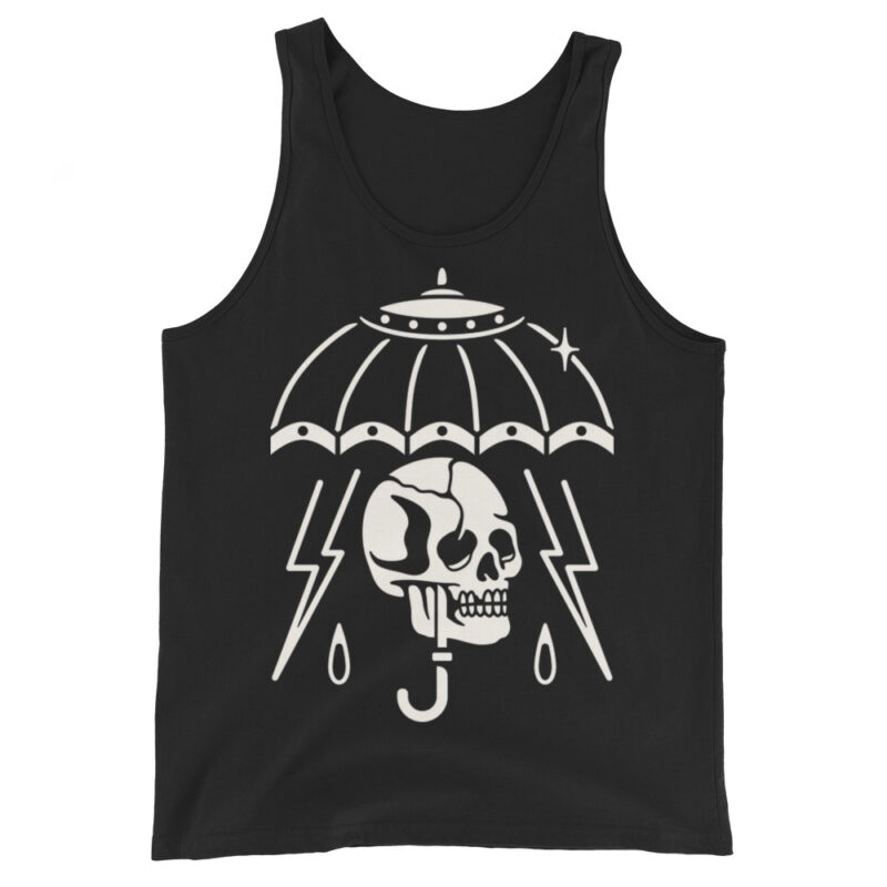 Linne i svart med ett stort tryck på framsidan med en tatueringsinspirerad dödskalle och ett paraply. Tillverkad i en skön kvalitet i 100% bomull. Passar perfekt till både män och kvinnor som älskar traditionella tatueringar.