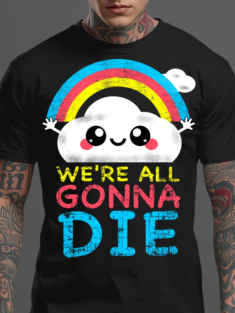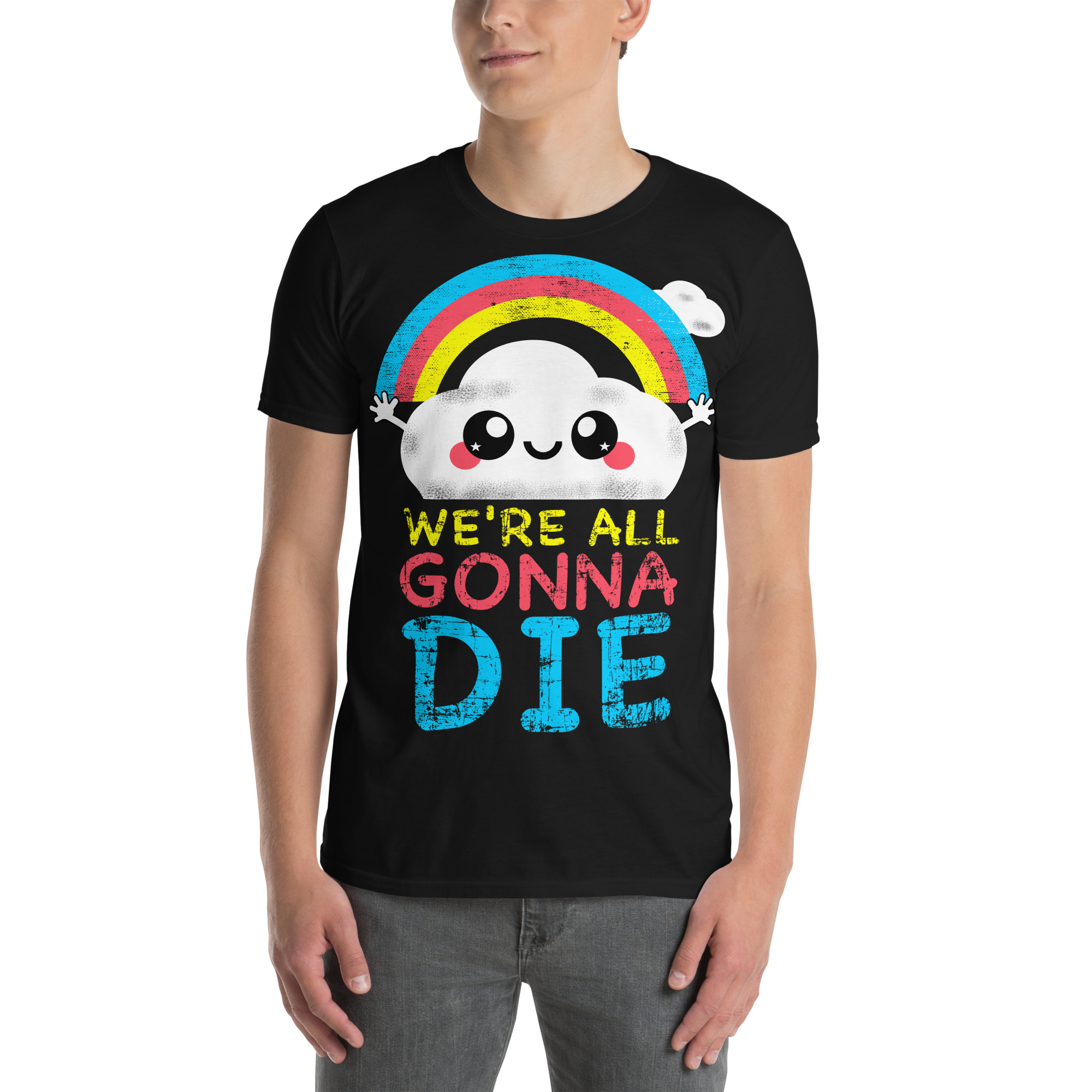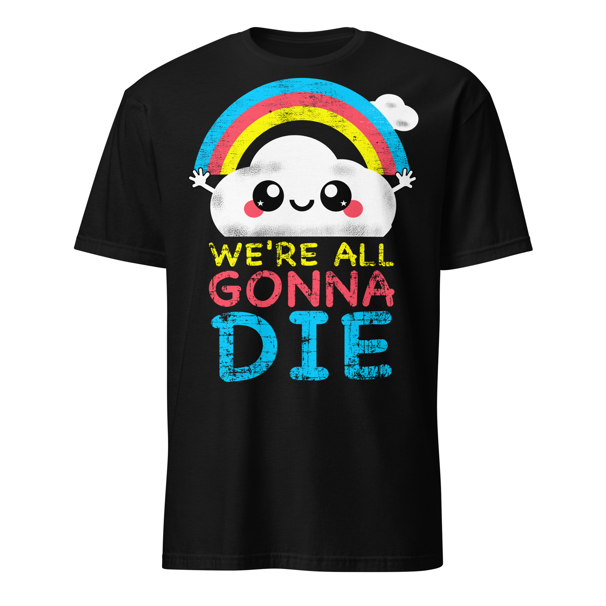 T-shirt i svart med ett glatt moln, en regnbåge och texten ’We’re all gonna die’ som dekoration på framsidan. Passar perfekt till kvinnor och män som älskar alternativa kläder. Tröjan är tillverkad i en supermjuk kvalitet i 100% bomull.
