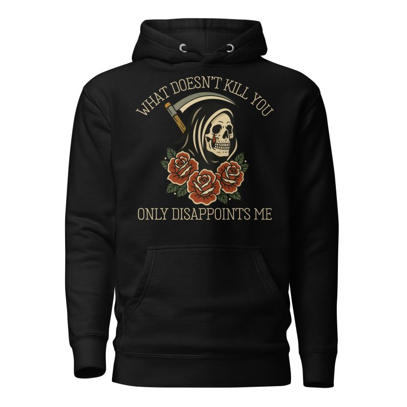 Hoodie i unisex-modell tillverkad i en extra fin kvalitet i blandad bomull och polyester. På framsidan återfinns ett tatueringsinspirerat tryck i old school-stil med liemannen, rosor och texten ’What doesn’t kill you only disappoints me’ som dekoration. Hoodien håller värmen riktigt bra och har ett otroligt mjukt tyg. Passar alla oss som älskar alternativa kläder.