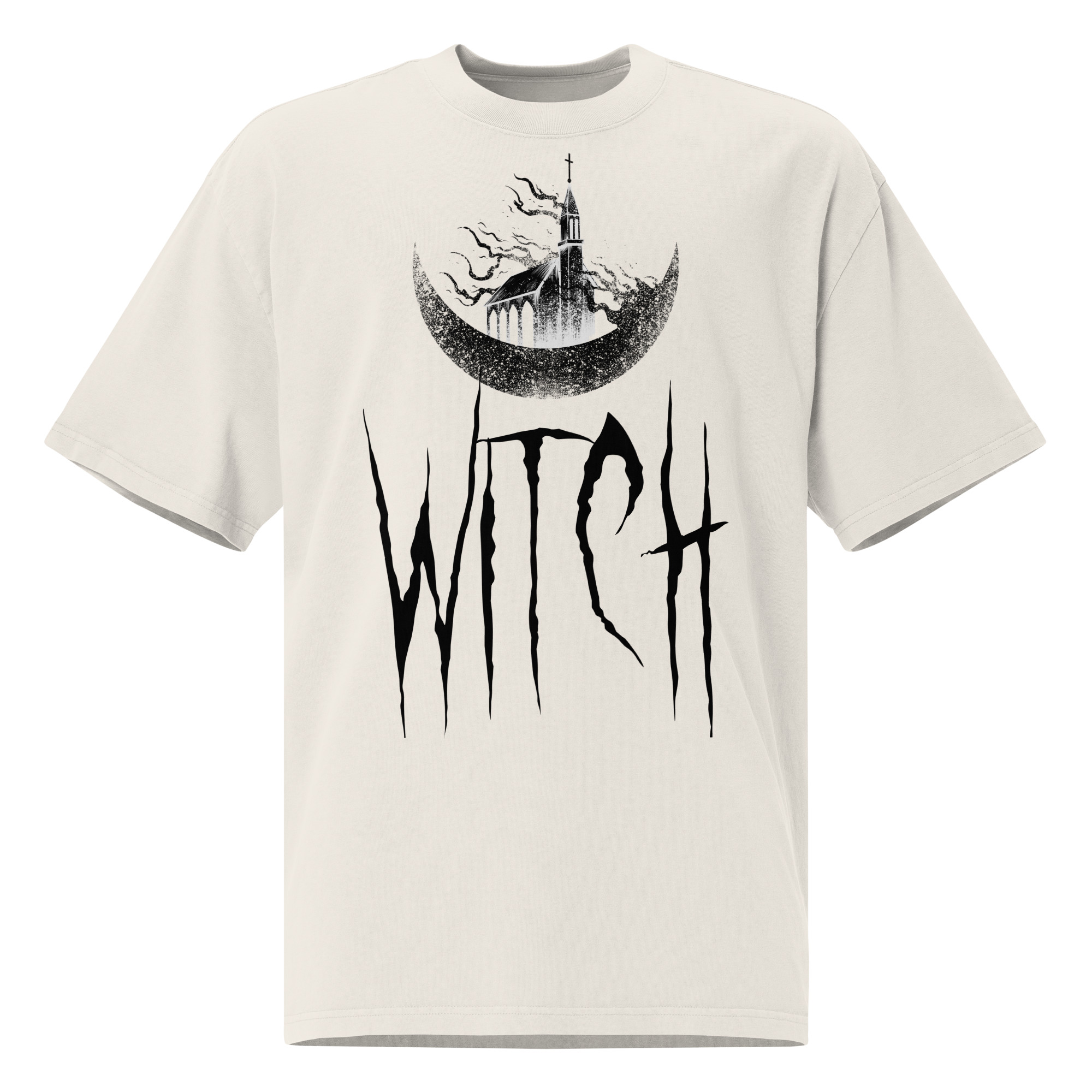 T-shirt i oversize-modell med en kyrka, en måne och texten ’Witch’ som motiv på framsidan. Tröjan passar perfekt till både män och kvinnor. Materialet är kammad bomull av hög kvalitet i en snygg tvättad vintage-färg. T-shirten är förkrympt så den tappar inte form eller storlek efter tvätt. Kommer verkligen dra blickarna till sig med sin använda look.