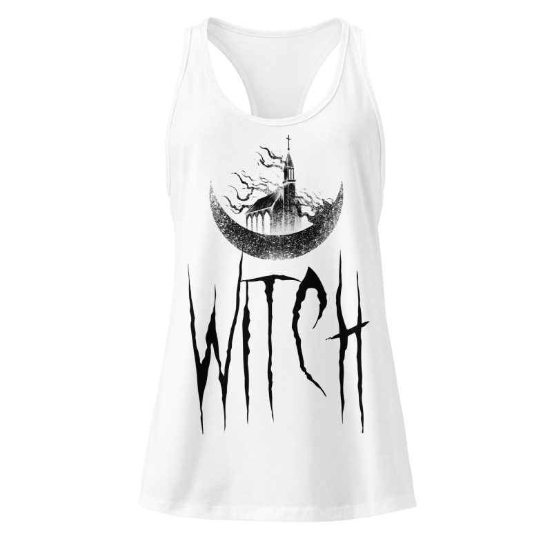 Snyggt linne i racerback-modell med ett stort alternativt tryck med texten ’Witch’ som dekoration på framsidan. Linnet är tillverkat i jersey i lättvikt för att följa kroppen perfekt. Materialet är mycket stretchigt och kommer bli din nya favorit.