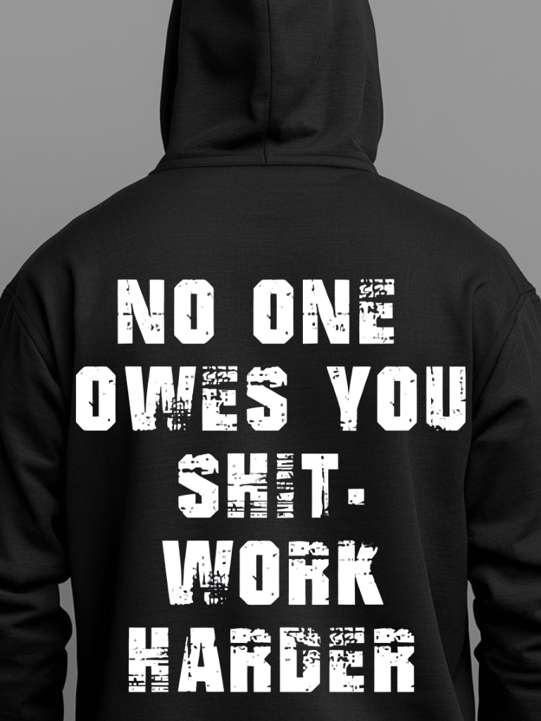 Hoodie i unisex-modell tillverkad i en extra fin kvalitet i blandad bomull och polyester. På baksidan återfinns texten ’No one owes you shit – work harder’ som dekoration. Hoodien håller värmen riktigt bra och har ett otroligt mjukt tyg. Passar alla oss som älskar den alternativa stilen.