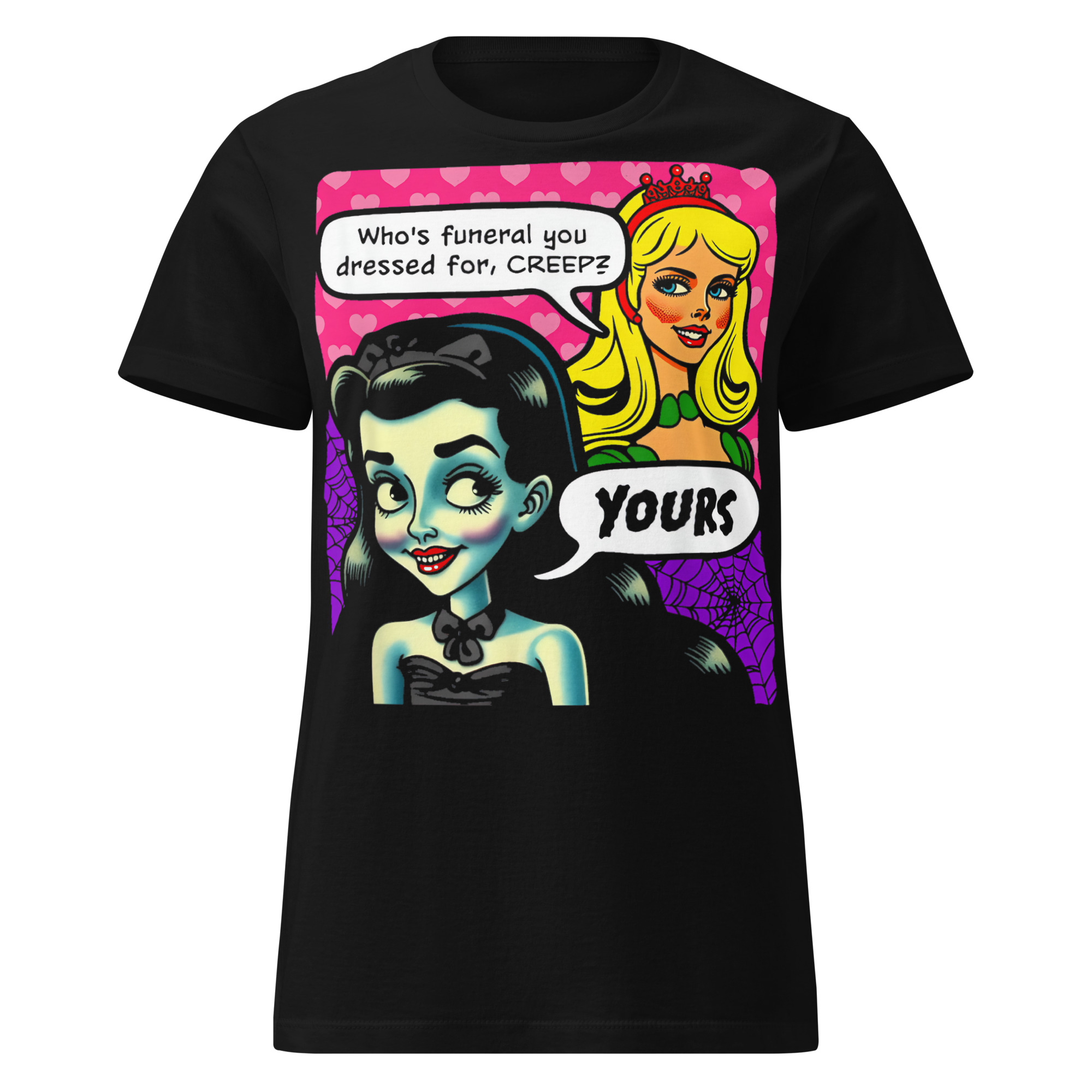 Semi-fitted t-shirt i svart med en blond kvinna och en alternativ kvinna och texten ’Who’s funeral you dressed for, CREEP? – Yours’ som dekoration på framsidan. Passar perfekt till kvinnor som älskar porr. Tröjan är tillverkad i en supermjuk kvalitet i 100% bomull.
